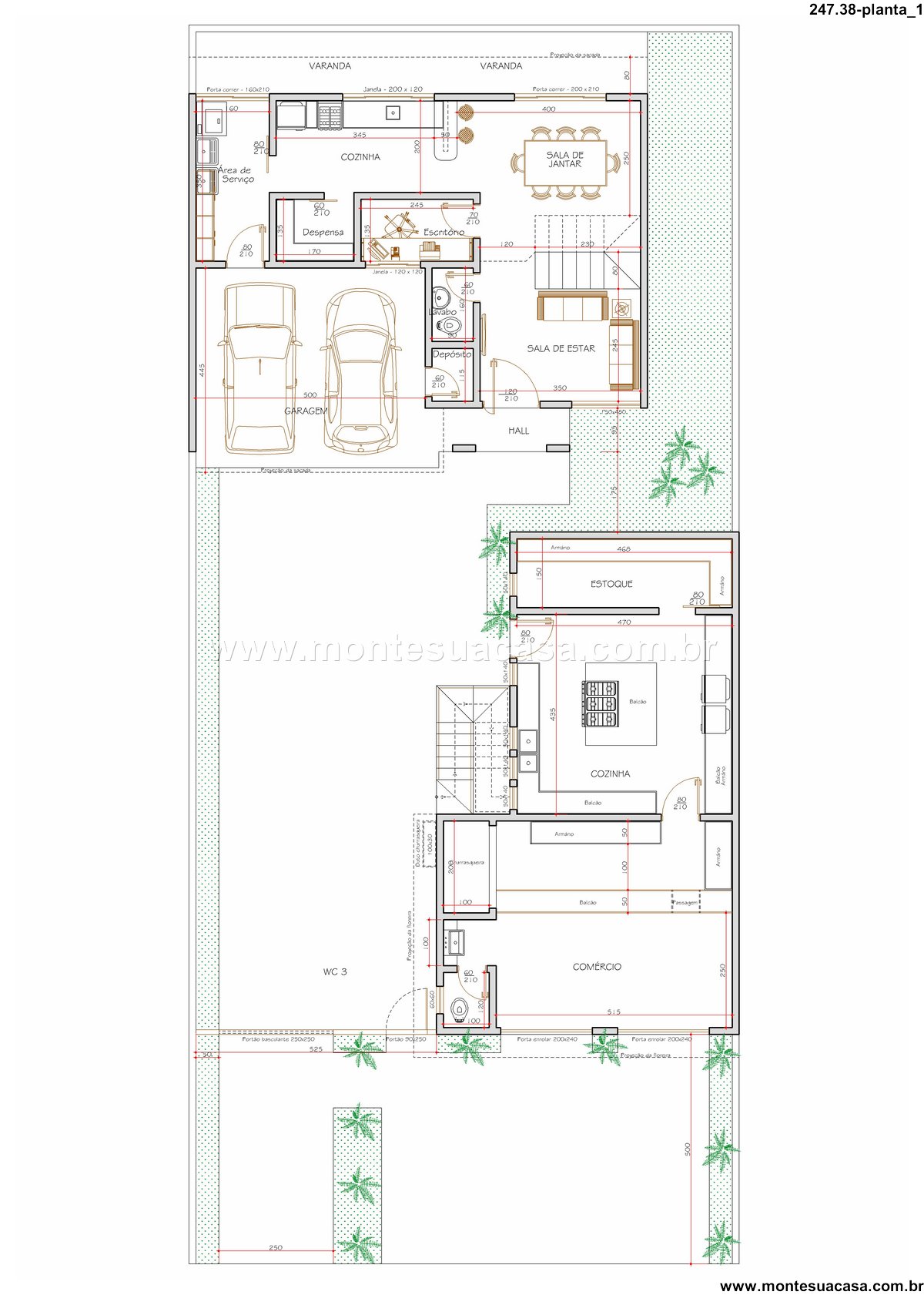 Projeto multifuncional com residência, comércio e sobrado nos fundos Com 247,38m², este projeto arquitetônico oferece uma solução completa para quem busca unir moradia, investimento e funcionalidade em um único terreno. A planta térrea apresenta uma área comercial independente, equipada com cozinha, estoque e banheiro, ideal para negócios que exigem atendimento ao público. No pavimento superior da área comercial, há uma segunda cozinha e ambientes de apoio que ampliam o potencial gastronômico e operacional do espaço.
