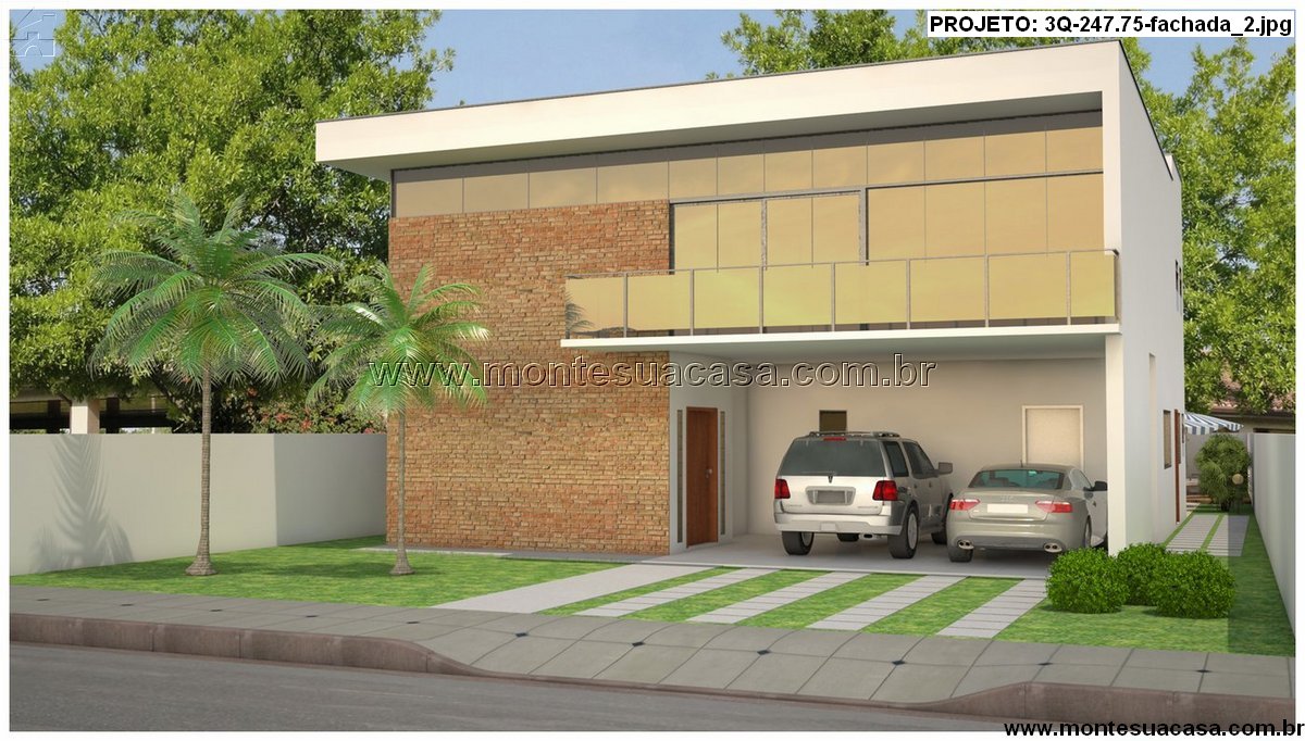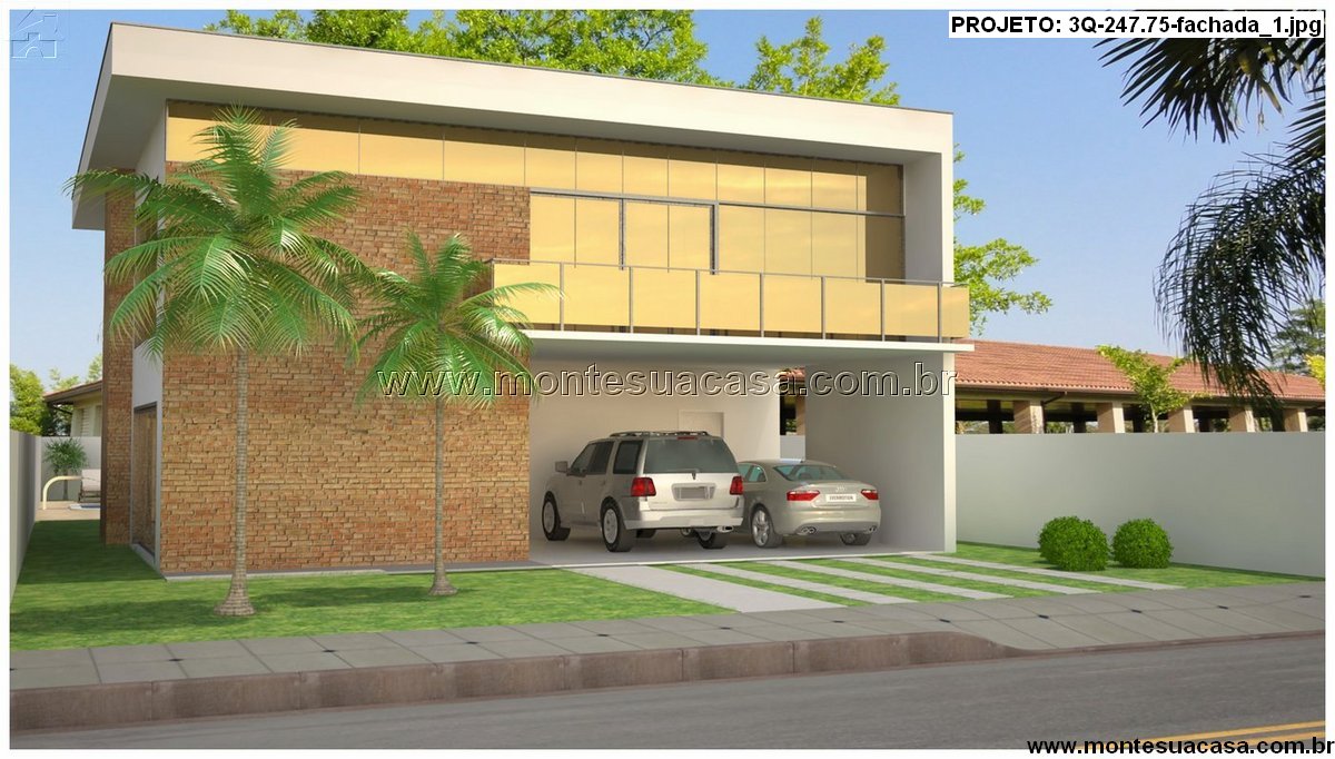 Este projeto de sobrado moderno com 247,75 m² foi cuidadosamente planejado para oferecer conforto, elegância e funcionalidade em cada ambiente. A fachada combina revestimento em tijolo aparente e painéis de vidro dourado, resultando em um visual sofisticado e contemporâneo que se destaca em qualquer bairro residencial.