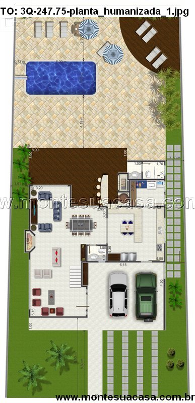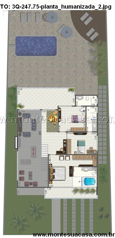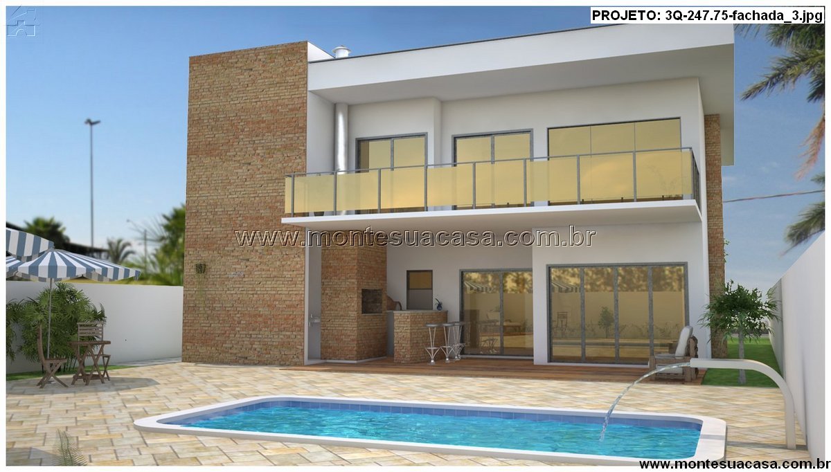 Projeto de sobrado moderno com 3 quartos, piscina e área gourmet integrada