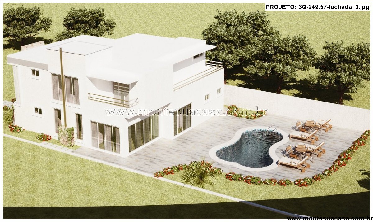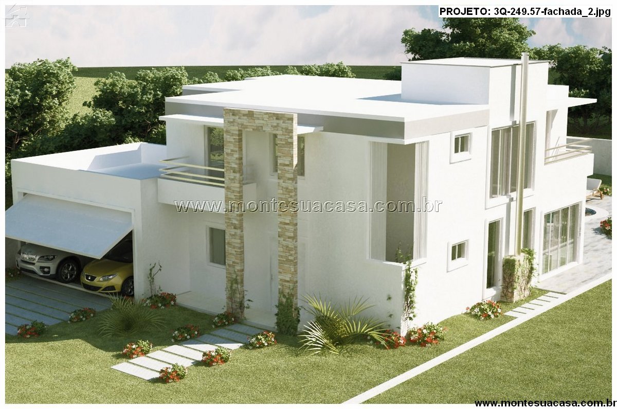 Este projeto de sobrado moderno com 249,57m² destaca-se pelo equilíbrio entre elegância e conforto. A fachada imponente combina volumes geométricos, revestimento em pedra e linhas retas que valorizam a estética contemporânea. O design aproveita ao máximo a iluminação natural, com amplas aberturas e janelas que integram os ambientes internos e externos de forma harmoniosa.