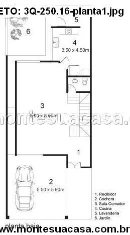 O piso térreo foi projetado para otimizar o convívio familiar. Logo na entrada, o hall de recepção (1) conduz à sala de estar e jantar integradas (3), que se conectam visualmente à cozinha (4), criando um ambiente espaçoso e convidativo. Um lavabo (2) garante conforto às visitas, enquanto a lavanderia (5) e o jardim nos fundos (6) completam o conjunto com praticidade e charme. O layout prioriza a circulação fluida e o contato com áreas verdes.