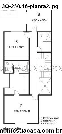 No piso superior encontram-se as áreas íntimas, oferecendo total privacidade. A suíte principal (7) possui generosas dimensões de 5,50m x 4,60m, além de espaço para closet e banheiro privativo. Os quartos secundários (8 e 9), cada um com 4,00m x 4,50m, garantem conforto e iluminação natural. O banheiro social e a área de circulação bem dimensionada completam o pavimento, mantendo o equilíbrio entre estética e funcionalidade.