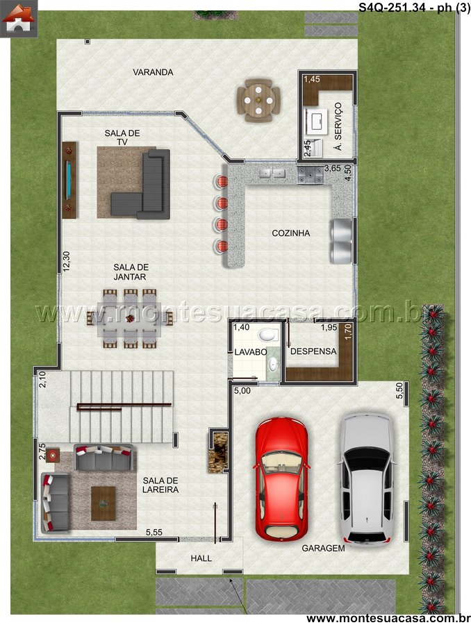 No pavimento térreo, você é recebido por um hall generoso que conduz à sala de lareira, um espaço aconchegante com 6.55 metros de comprimento. A integração é a palavra de ordem, conectando este ambiente diretamente à sala de jantar e à varanda. A área gourmet, destacada como uma churrasquerira, se abre para a varanda e a área de lazer, criando o cenário perfeito para reuniões e jantares especiais. A circulação entre esses espaços é fluida, promovendo uma sensação contínua de amplitude e convidando ao convívio. Um lavabo e a garagem completam este nível com muita funcionalidade.