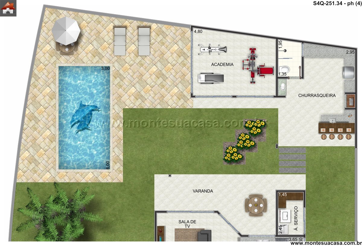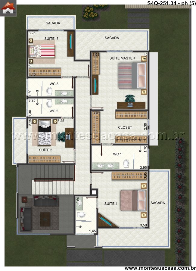 O pavimento superior é um refúgio de tranquilidade, abrigando quatro suítes que garantem conforto e independência para todos. A suíte master se destaca com suas dimensões generosas de 3.95m e conta com um closet exclusivo, oferecendo um ambiente organizado e elegante. As demais suítes, duas com 3.25m e uma com 3.50m, possuem acesso direto a sacadas, integrando o interior com o exterior e trazendo mais luminosidade aos ambientes. A presença de três banheiros no andar superior assegura praticidade e privacidade para o dia a dia da família.