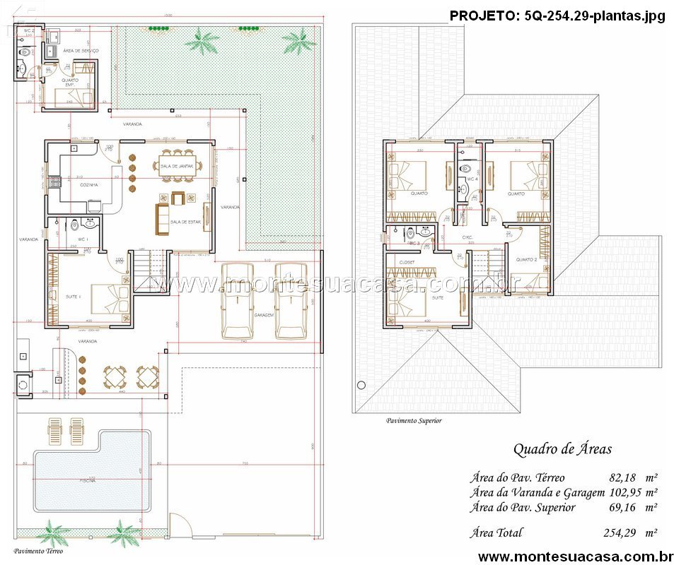 A organização interna foi meticulosamente planejada para separar as áreas sociais e íntimas de forma eficiente. O pavimento térreo, com 82.18m², abriga os ambientes de convívio, enquanto o superior, com 69.16m², é dedicado aos dormitórios, garantindo privacidade e tranquilidade. A varanha e garagem, somando 102.95m², complementam o projeto com um espaço de lazer e utilidade.