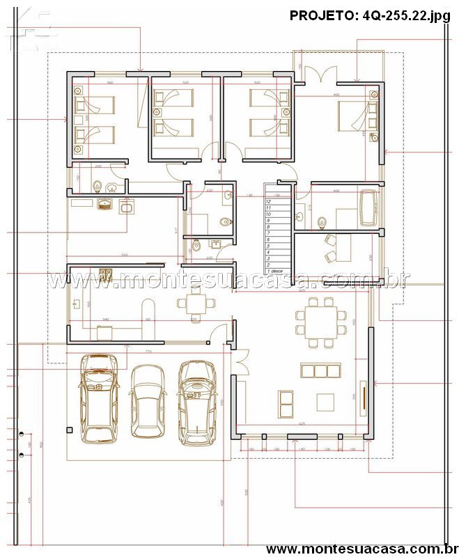 A garagem frontal para três veículos oferece acesso rápido ao interior da residência, além de espaço para motos ou equipamentos. A cobertura robusta garante proteção e praticidade no dia a dia. Ventilação lateral e circulação independente aumentam o conforto para quem entra e sai com frequência, evitando interferência nos demais ambientes.