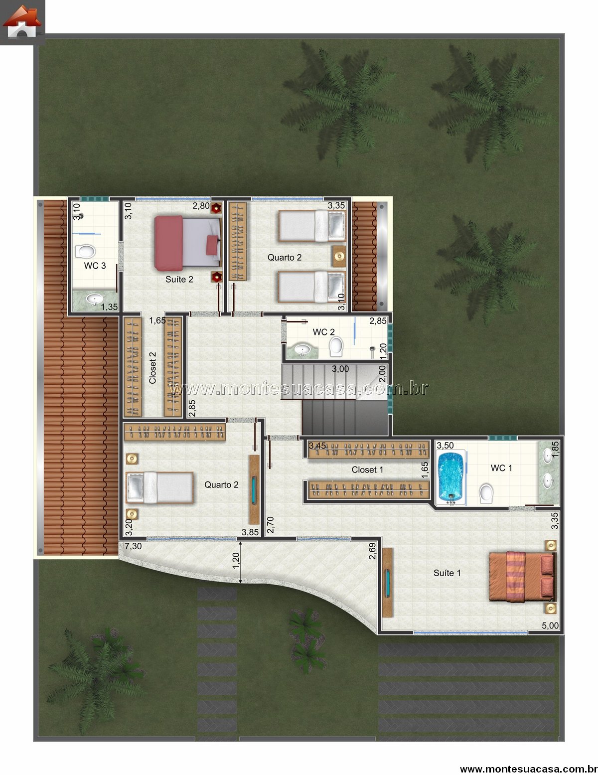 Área íntima no pavimento superior No andar superior, encontram-se quatro dormitórios bem distribuídos, incluindo duas suítes completas com closet. A suíte principal possui dimensões generosas e banheiro privativo, garantindo conforto e privacidade. Os quartos adicionais são ideais para filhos, hóspedes ou uso flexível. A circulação entre os ambientes é otimizada, promovendo funcionalidade e bem-estar.