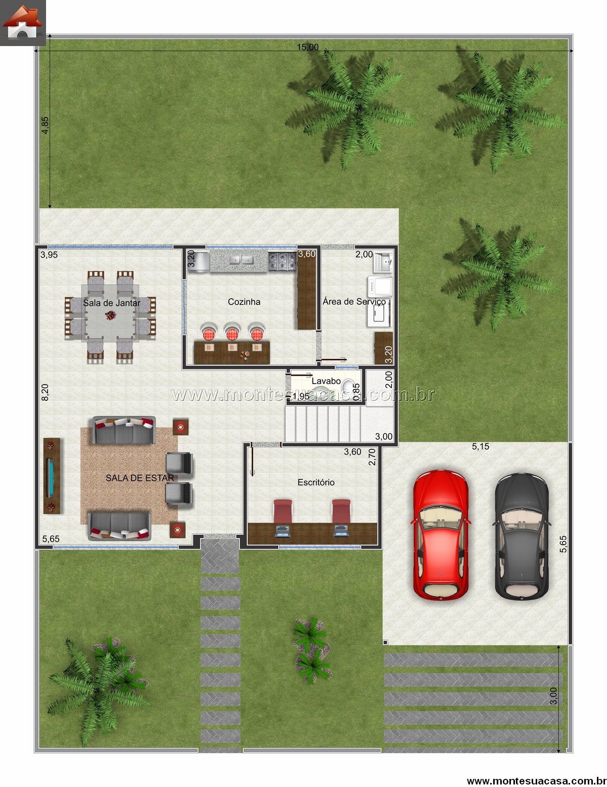 Ambientes sociais e funcionais no térreo O pavimento térreo abriga os espaços sociais e funcionais da casa. A sala de estar e a sala de jantar são integradas, criando um ambiente fluido e acolhedor. A cozinha, posicionada estrategicamente, conecta-se à copa e à área de serviço, facilitando a rotina doméstica. Um escritório reservado oferece privacidade para trabalho remoto ou estudos. A garagem coberta comporta dois veículos com acesso direto à entrada principal.