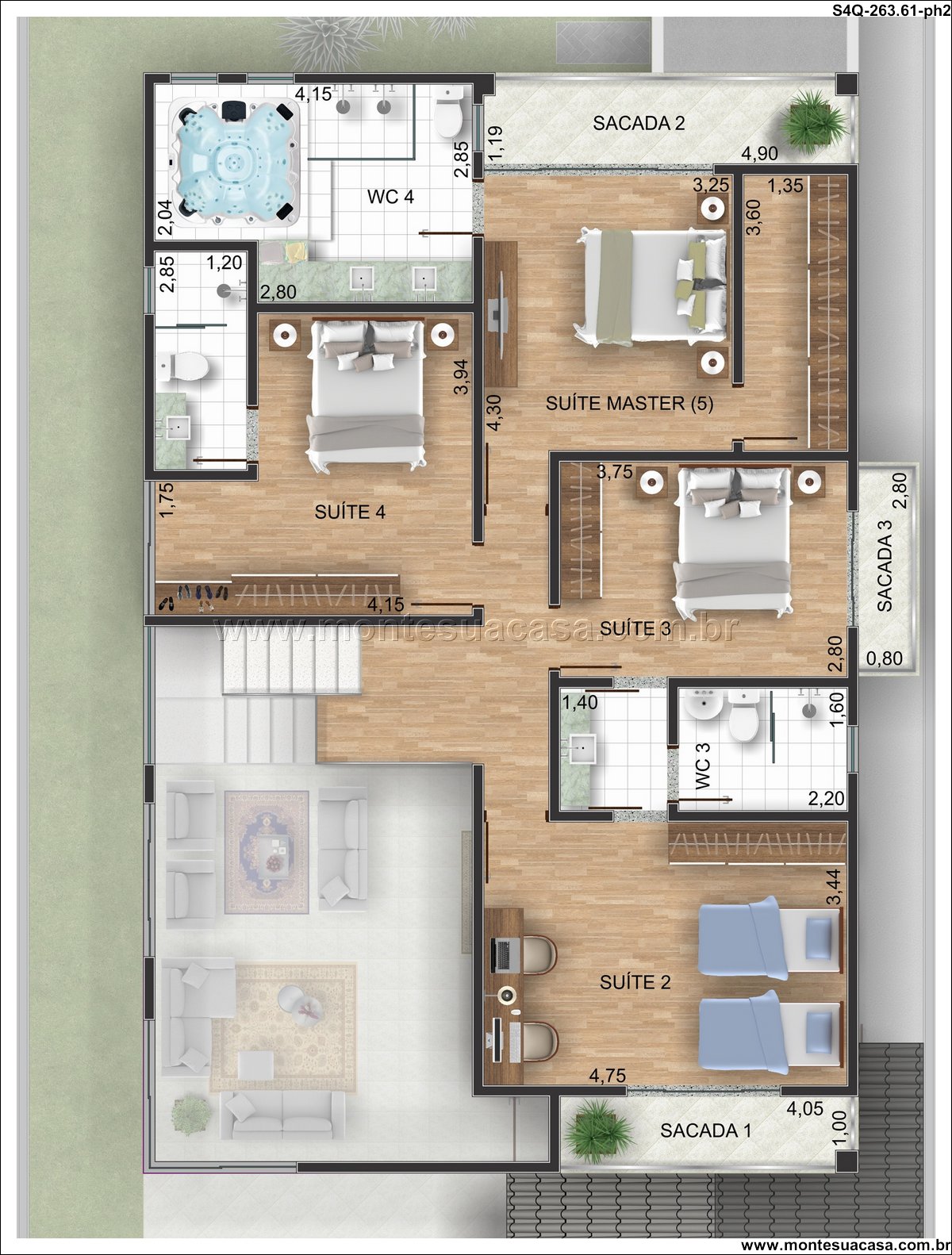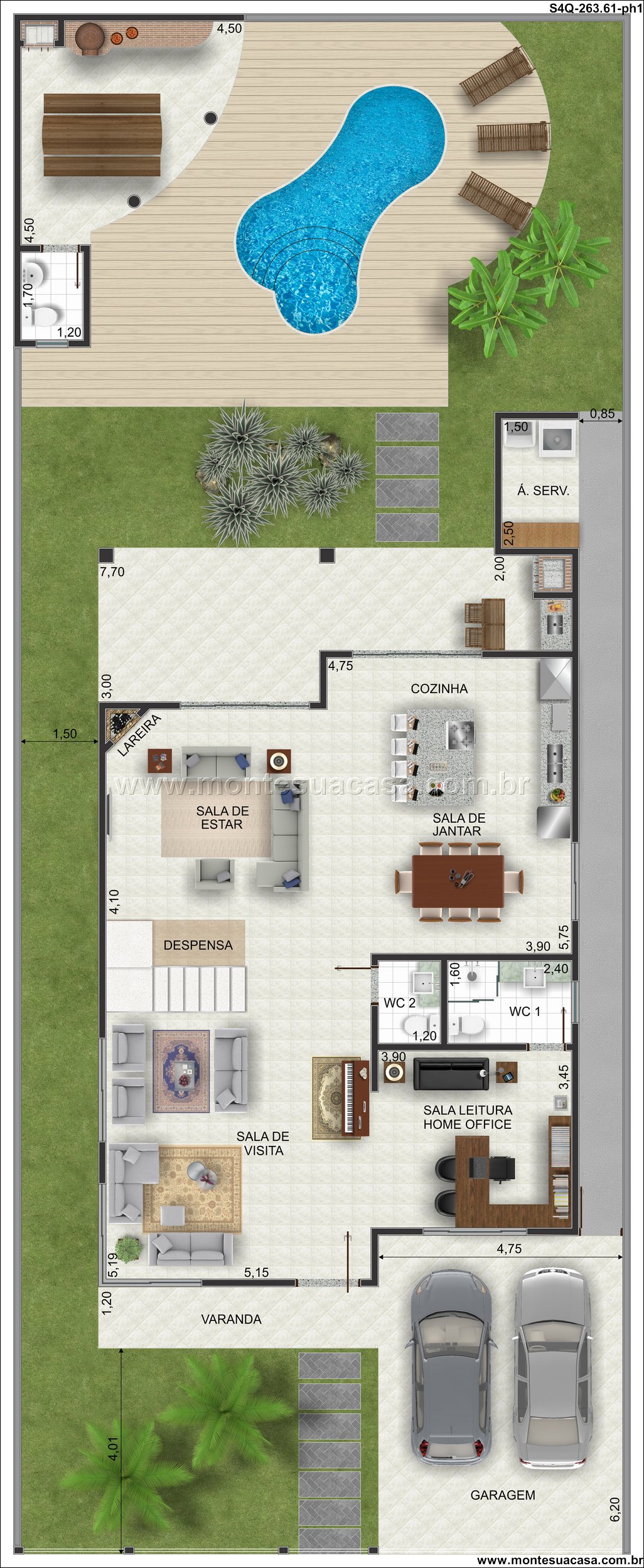 O projeto oferece quatro quartos, proporcionando privacidade e conforto para todos os moradores. Os banheiros sociais e íntimos (WC 1 e WC 2) atendem com eficiência às necessidades da casa, evitando congestionamentos. A garagem generosa, com 6.20m de frente, assegura espaço suficiente para veículos e possível armazenamento. A localização estratégica dos dormitórios garante tranquilidade, enquanto as áreas comuns incentivam a interação, estabelecendo um equilíbrio perfeito entre vida privada e coletiva.
