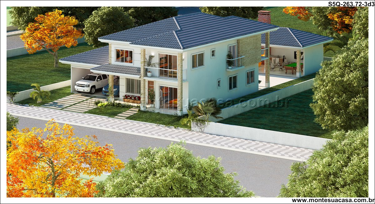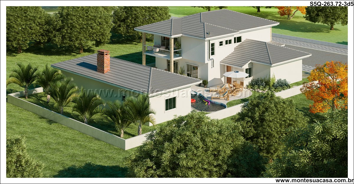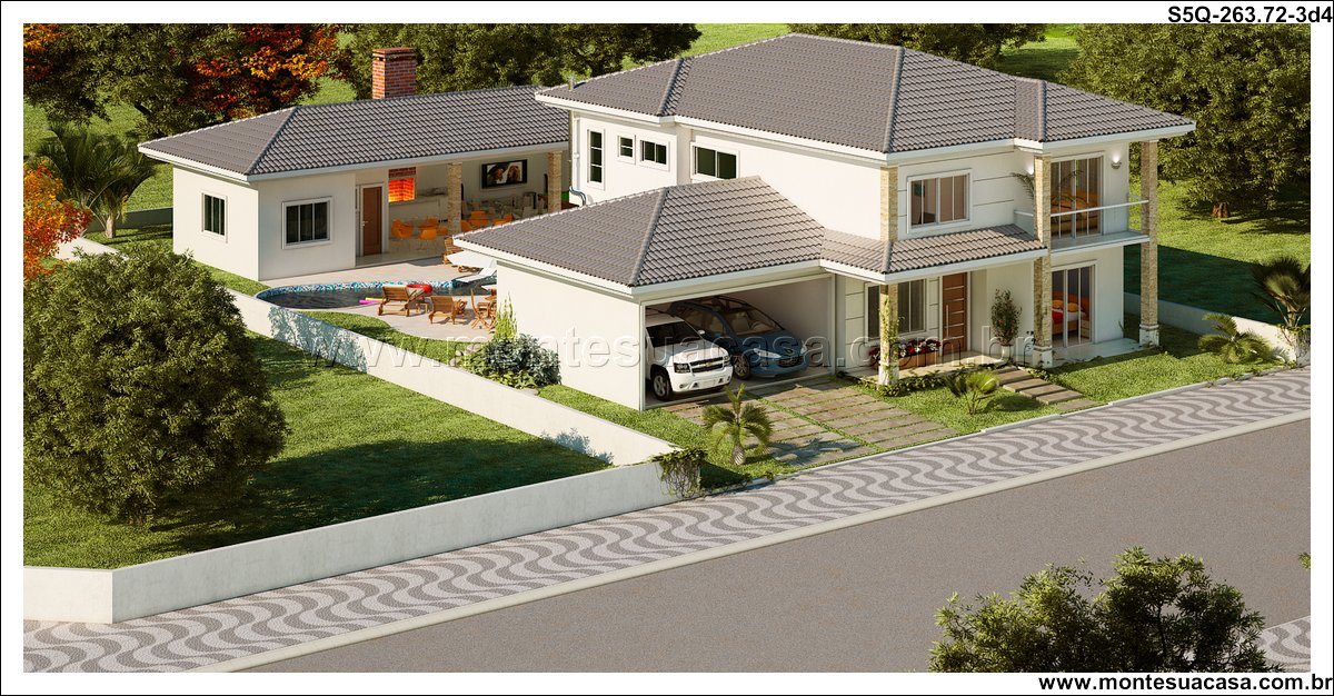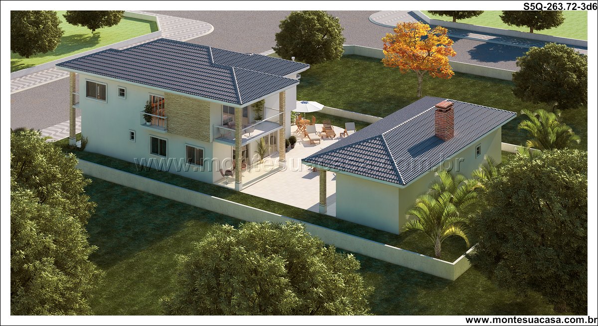 Este sobrado contemporâneo, com seus 263.72m², oferece um layout inteligente e sofisticado distribuído em dois pavimentos. A residência foi projetada para uma família que busca conforto, privacidade e amplos espaços para entretenimento. Com cinco quartos, sendo uma suíte master com closet e sacada, este projeto prioriza a funcionalidade sem abrir mão do estilo.