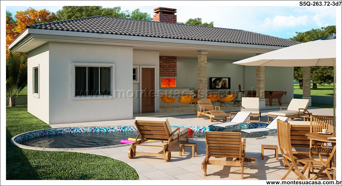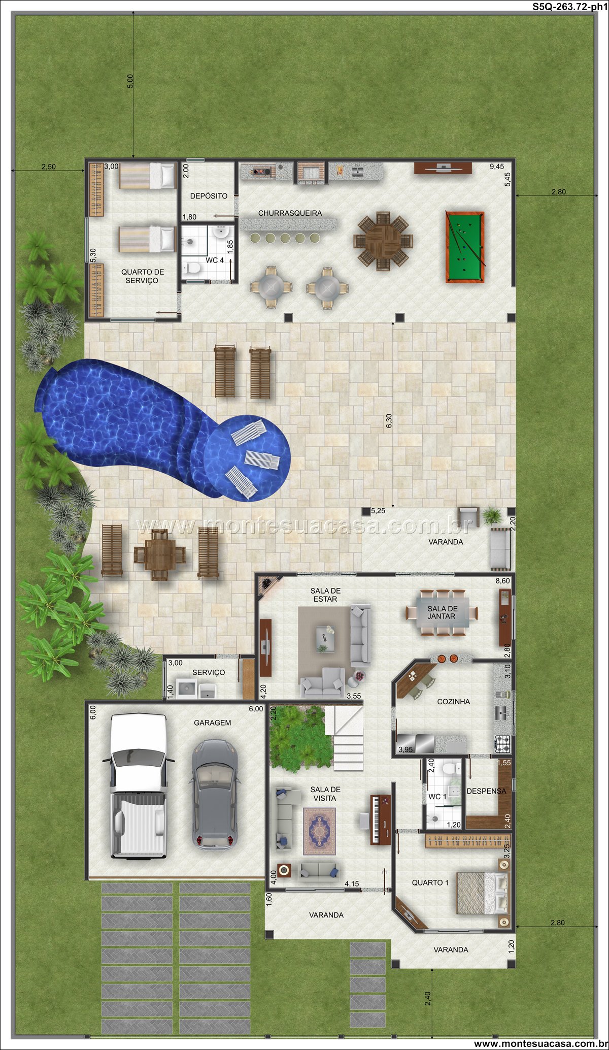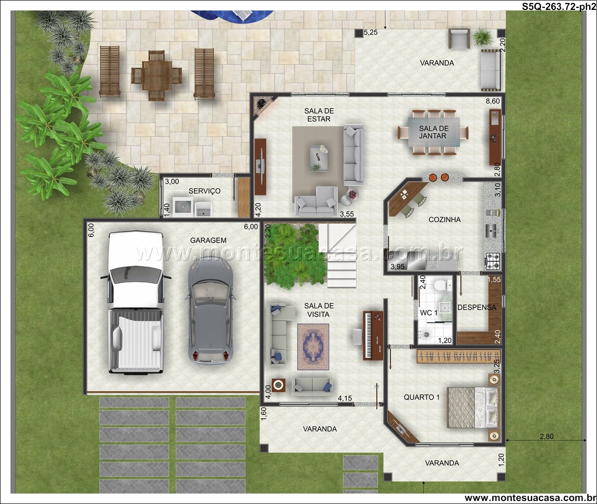 Este sobrado contemporâneo, com seus 263.72m², oferece um layout inteligente e sofisticado distribuído em dois pavimentos. A residência foi projetada para uma família que busca conforto, privacidade e amplos espaços para entretenimento. Com cinco quartos, sendo uma suíte master com closet e sacada, este projeto prioriza a funcionalidade sem abrir mão do estilo.