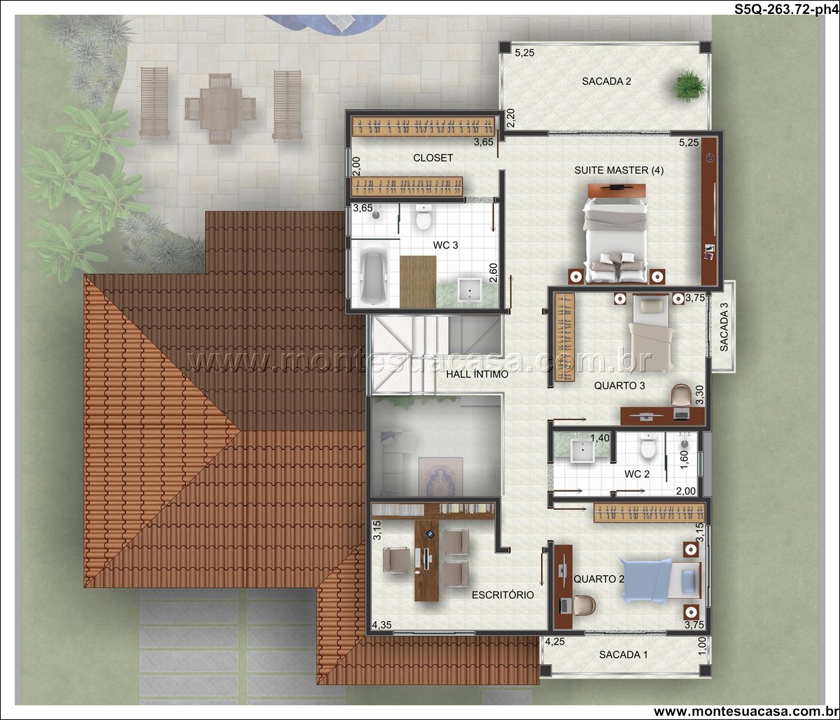 O projeto integra perfeitamente os ambientes sociais e íntimos, criando uma fluidez que valoriza cada metro quadrado. A suíte master se destaca com seu generoso espaço, closet organizado e sacada privativa. Os demais quartos são bem distribuídos, acompanhados de hall íntimo e dois banheiros sociais, garantindo conforto para todos os moradores. Um escritório oferece um ambiente propício para trabalho ou estudos.