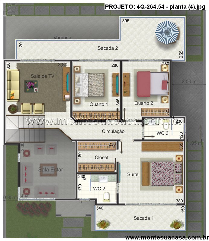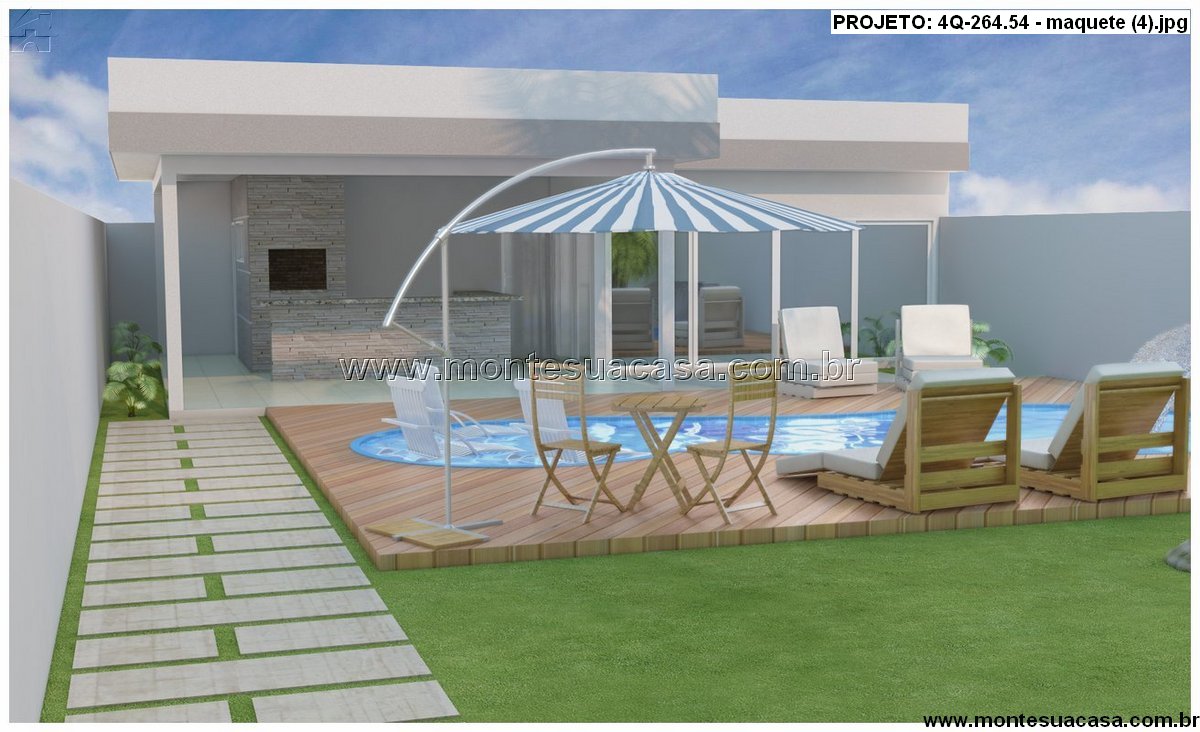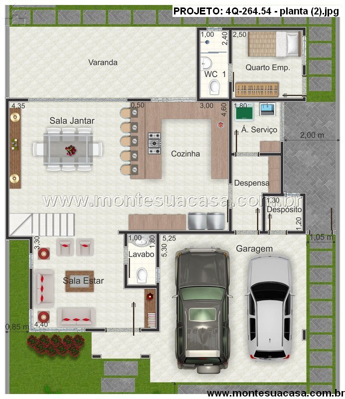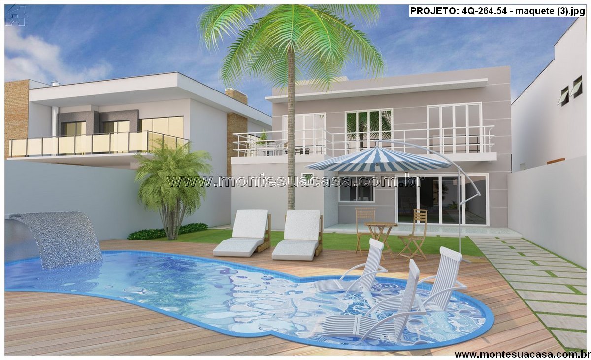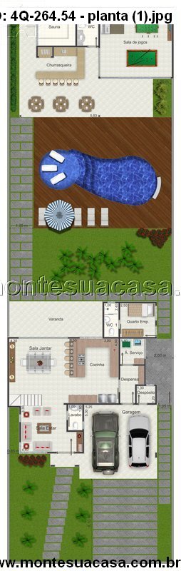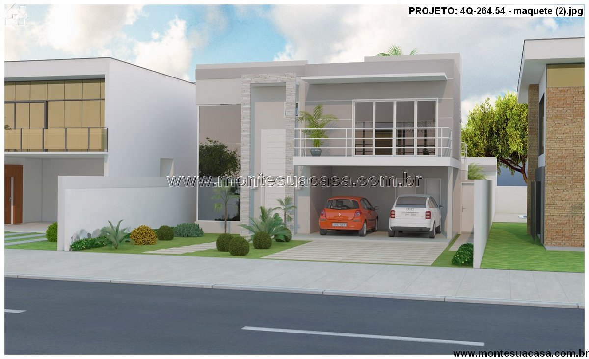 Projeto arquitetônico com lazer completo e estética moderna Este projeto de 264,54m² apresenta uma residência sofisticada em estilo sobrado, ideal para quem busca conforto, funcionalidade e integração com áreas de lazer. A fachada contemporânea combina materiais como concreto, vidro e tijolos aparentes, criando uma estética elegante e acolhedora. O paisagismo frontal valoriza o conjunto com gramado, arbustos e árvores ornamentais, além de uma garagem coberta para dois veículos.