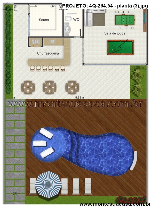 Área externa com lazer e entretenimento O destaque do projeto está na área de lazer nos fundos. A piscina com formato orgânico inclui uma seção rasa com cadeiras submersas e uma área de deck com espreguiçadeiras. Há também uma sauna, sala de jogos com mesa de sinuca e pebolim, além de um espaço gourmet com churrasqueira e mesas para refeições ao ar livre. O ambiente é ideal para receber convidados e aproveitar momentos de descanso.