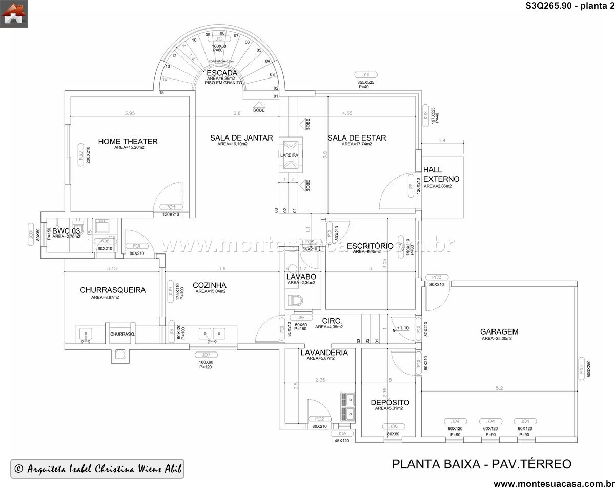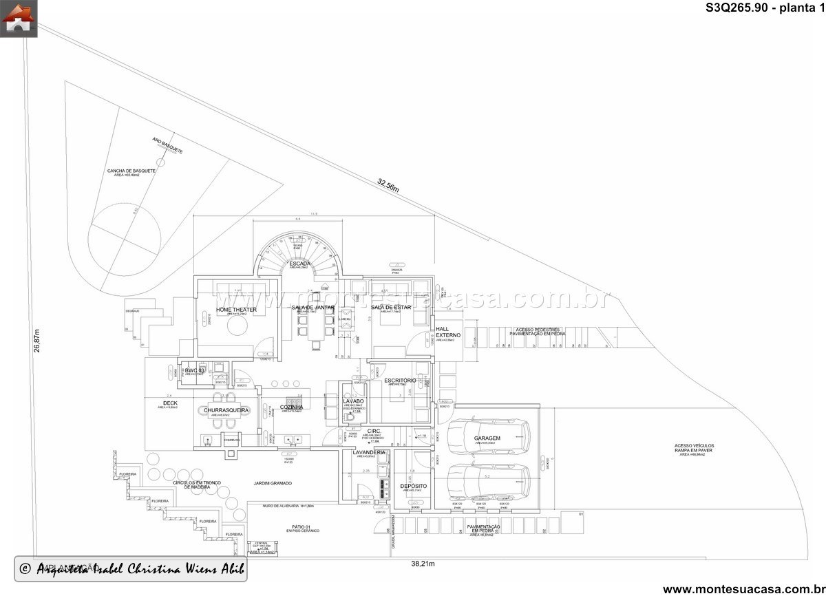 Este projeto de sobrado moderno de 265.90m² foi meticulosamente planejado para oferecer um estilo de vida contemporâneo e integrado em dois pavimentos. A planta baixa do térreo demonstra uma organização inteligente dos ambientes, priorizando a fluidez e o convívio social. A fachada, apresentada nas imagens, sugere uma arquitetura com linhas clean e um apelo visual acolhedor. Cada espaço foi dimensionado para criar uma harmonia perfeita entre a vida cotidiana, o descanso e o entretenimento, atendendo perfeitamente às necessidades de uma família.