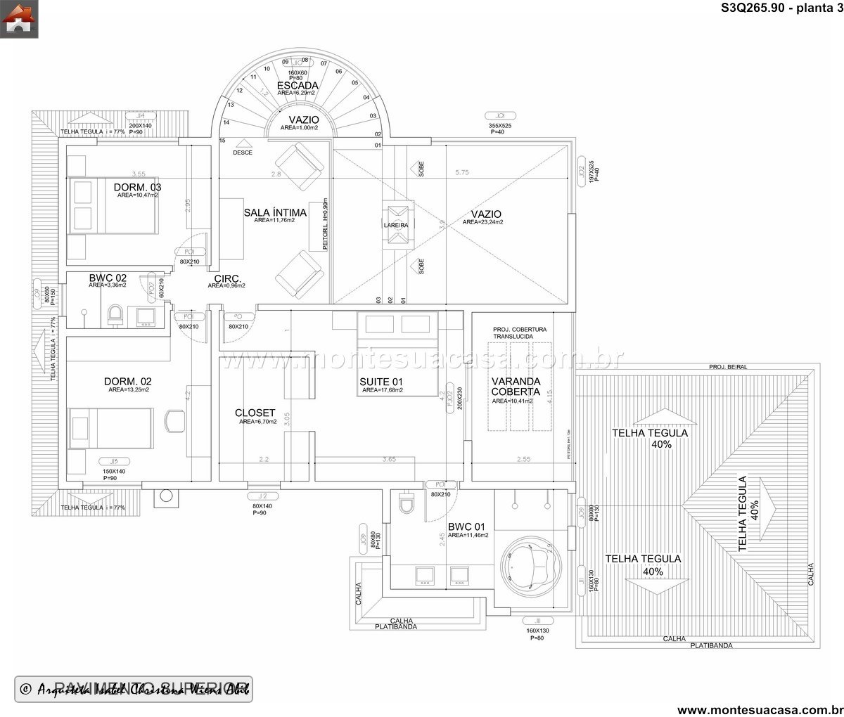 O projeto oferece três quartos, provavelmente localizados no pavimento superior para garantir total privacidade e sossego. Eles são compostos pelo suíte principal, que proporciona um refúgio intimista para os moradores, e mais dois quartos adicionais, ideais para filhos ou hóspedes. Todos os dormitórios são integrados a um banheiro social bem distribuído, assegurando conforto e praticidade para toda a família. A circulação bem resolvida entre os ambientes superiores complementa a funcionalidade deste sobrado.