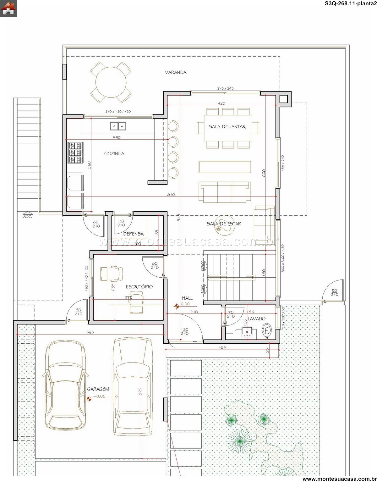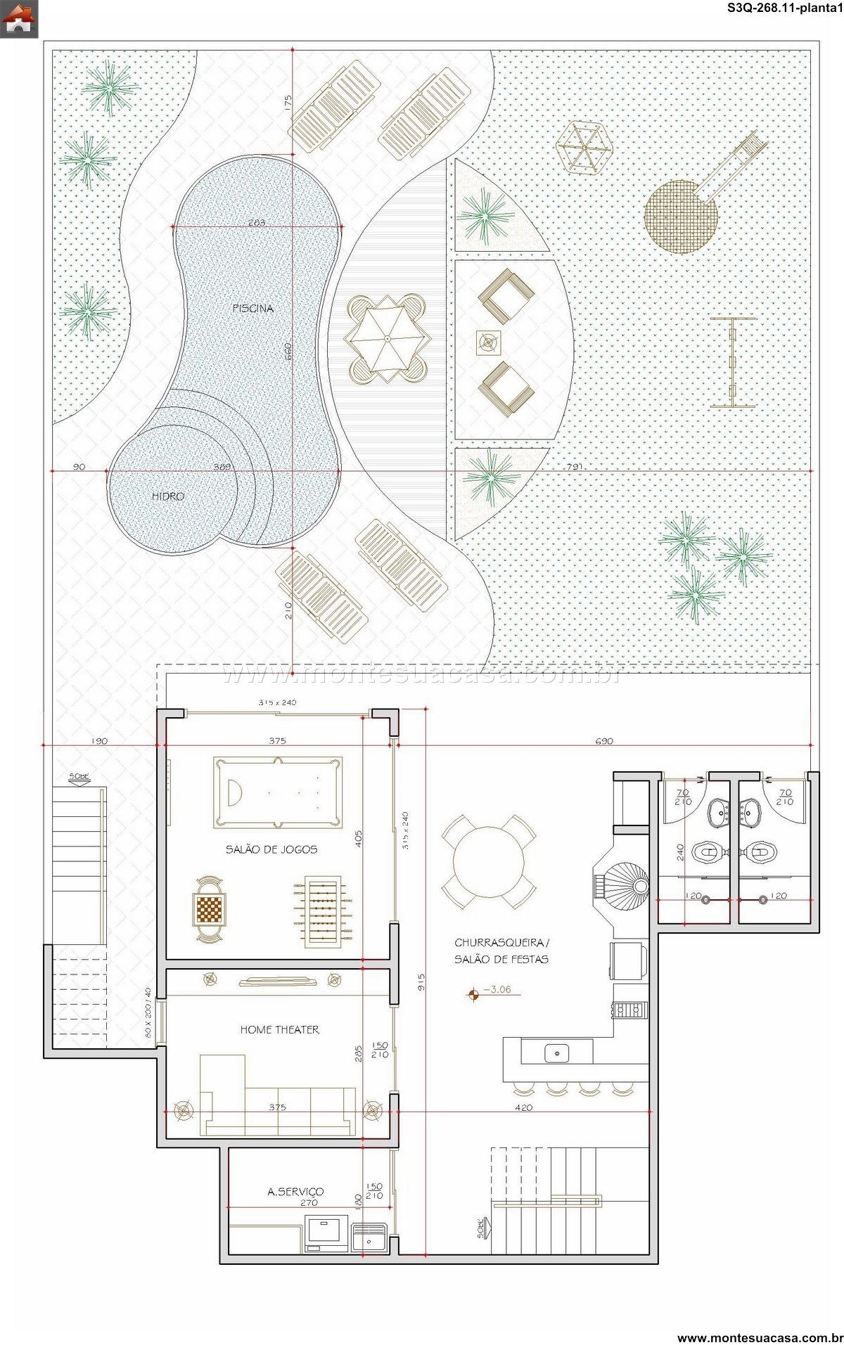 A área social se destaca pela fluidez entre os ambientes. A varanda generosa de 270 x 240 serve como prelúdio para os espaços internos, conectando-se perfeitamente à sala de jantar de 600 e à cozinha de 420. Estes ambientes convergem para uma área gourmet completa com churrasqueira, formando o coração da casa para receber amigos e familiares. Adicionalmente, o projeto inclui um salão de jogos dedicado e um home theater, elevando o entretenimento a outro patamar.