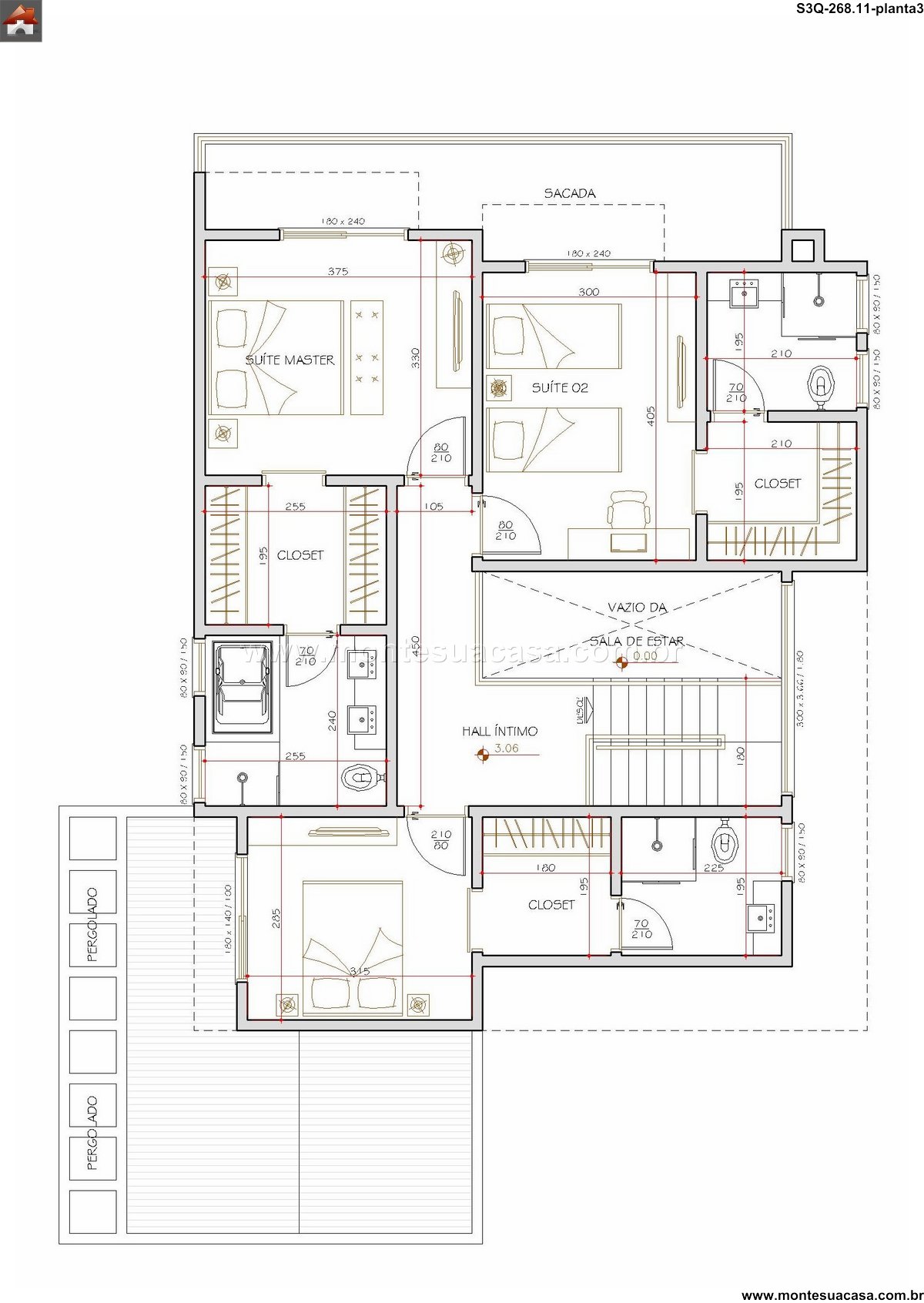Os três quartos oferecem conforto e praticidade para a família. O projeto otimiza a circulação através de um hall distribuidor bem dimensionado, garantindo privacidade aos dormitórios. A suíte master provavelmente ocupa uma posição privilegiada com ampla metragem. Os ambientes de serviço foram cuidadosamente planeados com lavabo, área de serviço e despensa, assegurando funcionalidade no dia a dia.