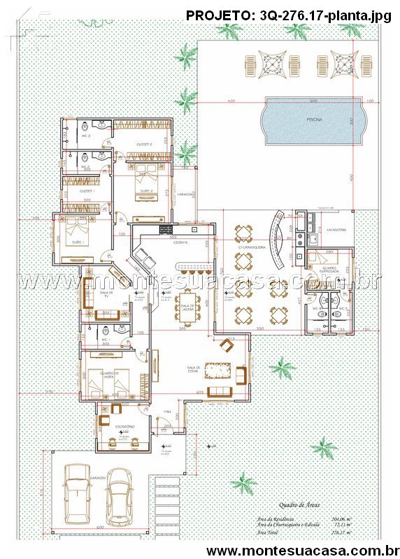 Este projeto de residência térrea oferece uma planta inteligente e acolhedora, ideal para famílias que valorizam conforto, integração e lazer. Com 276,17 m² de área total, sendo 266,84 m² de área construída e 39,00 m² dedicados à piscina e deck, o layout foi cuidadosamente planejado para proporcionar fluidez entre os espaços internos e externos.