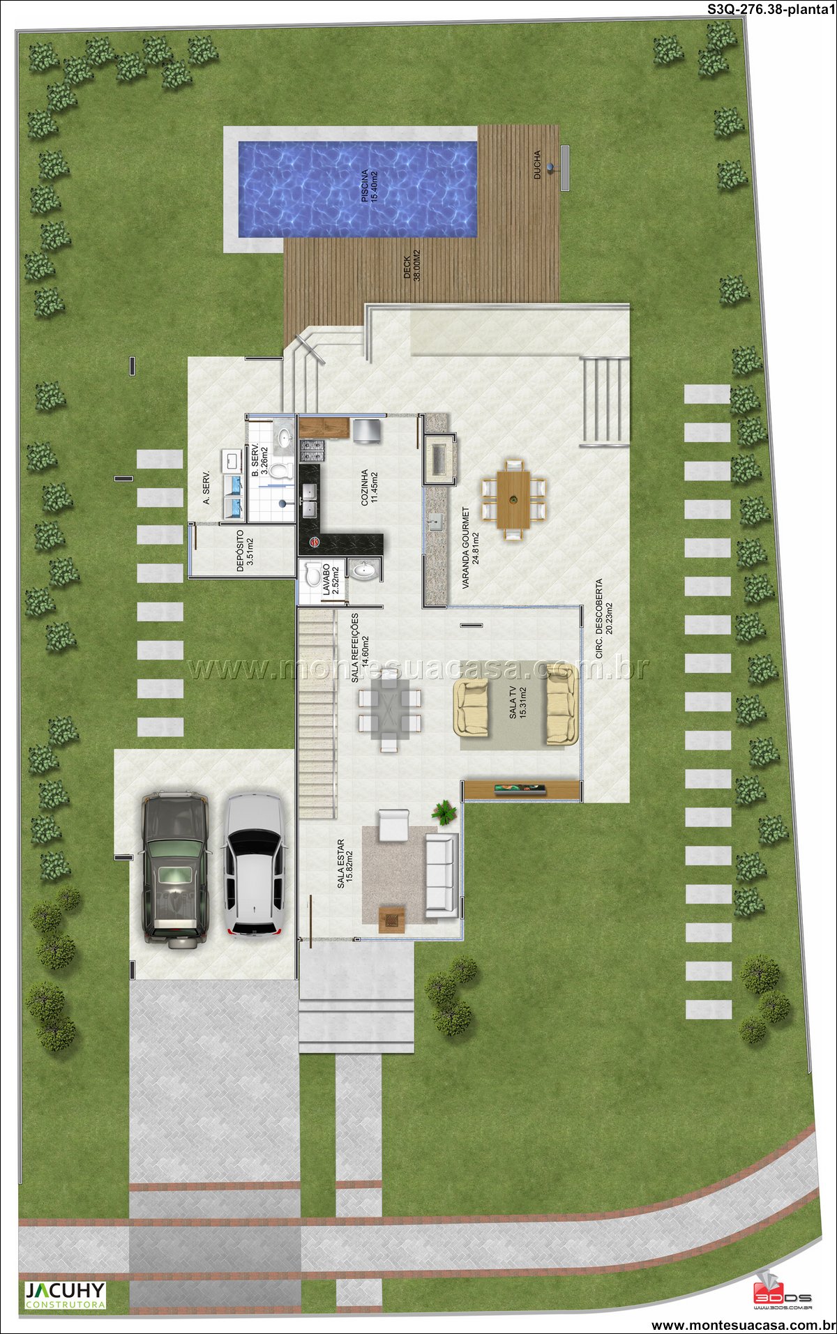 Descubra o ápice do conforto neste sobrado de 276.38m², projetado para famílias que buscam sofisticação e funcionalidade em uma distribuição vertical. A planta inteligente harmoniza ambientes sociais generosos no pavimento térreo com uma área íntima exclusiva no andar superior. Consequentemente, cada metro quadrado é otimizado para oferecer privacidade, praticidade e bem-estar. A circulação fluida entre os cômodos cria uma sensação de amplitude e acolhimento, característica marcante de um bom projeto de sobrado.