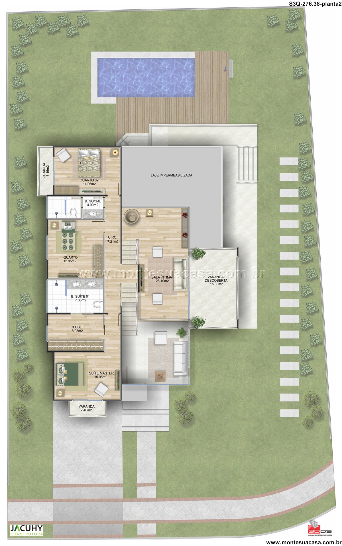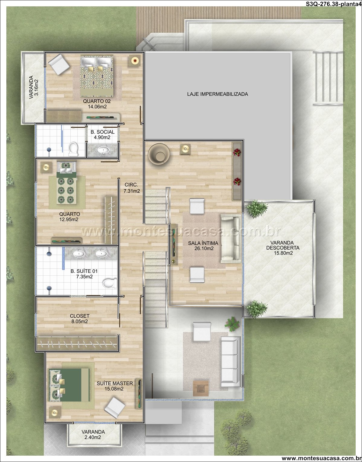 O andar superior abriga um refúgio privativo, com a suíte master de 15.08m², closet dedicado de 8.05m² e banheiro espaçoso. Este ambiente oferece total privacidade e conforto, separado da agitação dos ambientes sociais. A área íntima ainda conta com mais dois quartos, sendo um deles uma suíte com banheiro de 7.35m² e outro quarto de 14.06m². Todos os ambientes são complementados por um banheiro social e uma ampla circulação, garantindo comodidade para todos os residentes.