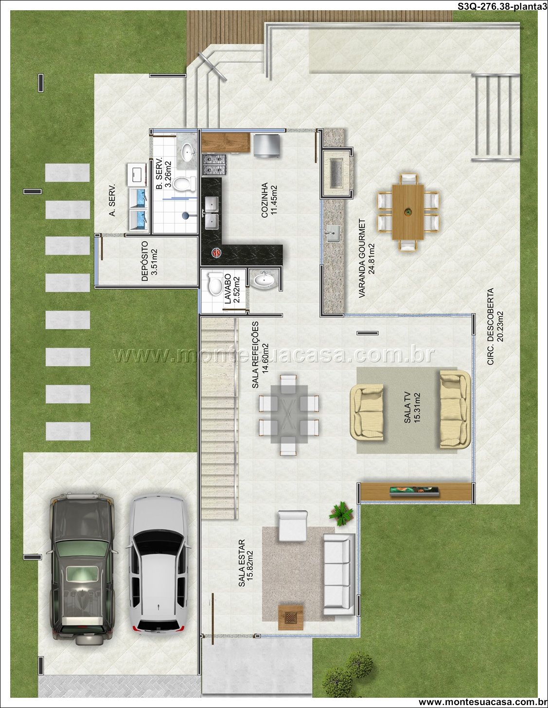 A área social do térreo é um verdadeiro destaque, com uma sala íntima de 26.10m² integrando-se perfeitamente a uma varanda descoberta de 16.90m². Esta configuração é ideal para receber amigos e desfrutar de momentos de descontração. Além disso, o projeto oferece uma sala de estar e uma sala de TV independentes, proporcionando versatilidade para diferentes ocasiões. A varanda gourmet de 24.81m², anexa à cozinha de 11.45m², se torna o coração das reuniões, perfeita para refeições descontraídas e entretenimento, com fácil acesso à área descoberta.