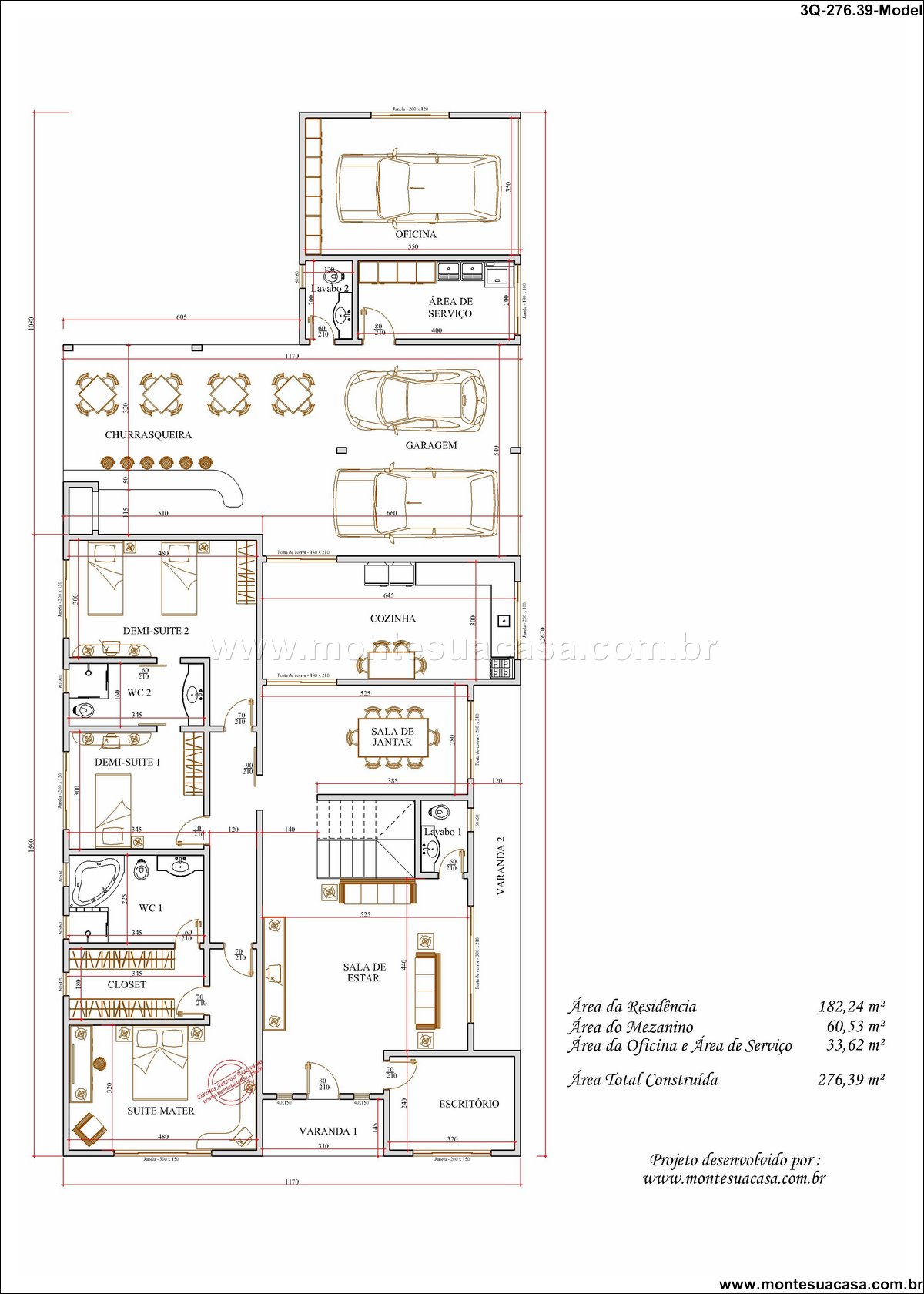 Design inteligente e aproveitamento total da área Com uma área construída total de 276,39m², o projeto equilibra estética e funcionalidade. A circulação é fluida, os ambientes são bem posicionados e cada espaço foi pensado para atender às necessidades modernas de moradia. A presença da oficina e do mezanino torna este projeto único, ideal para quem busca uma casa com personalidade e múltiplas possibilidades de uso.