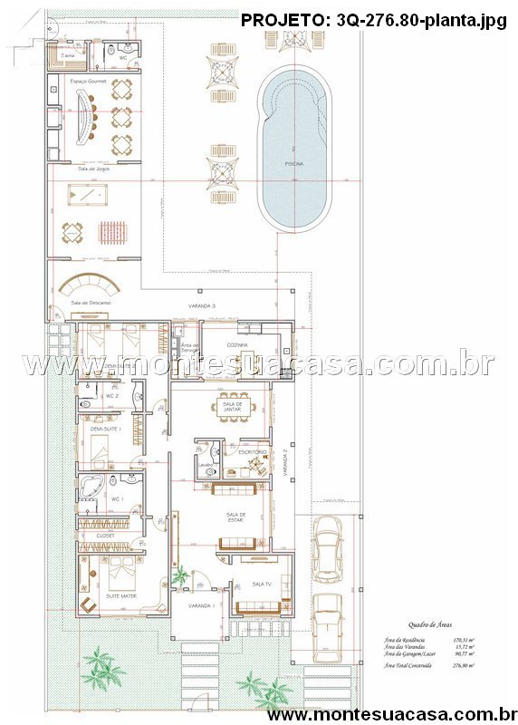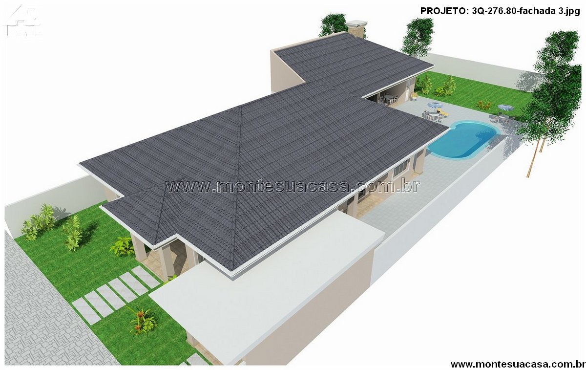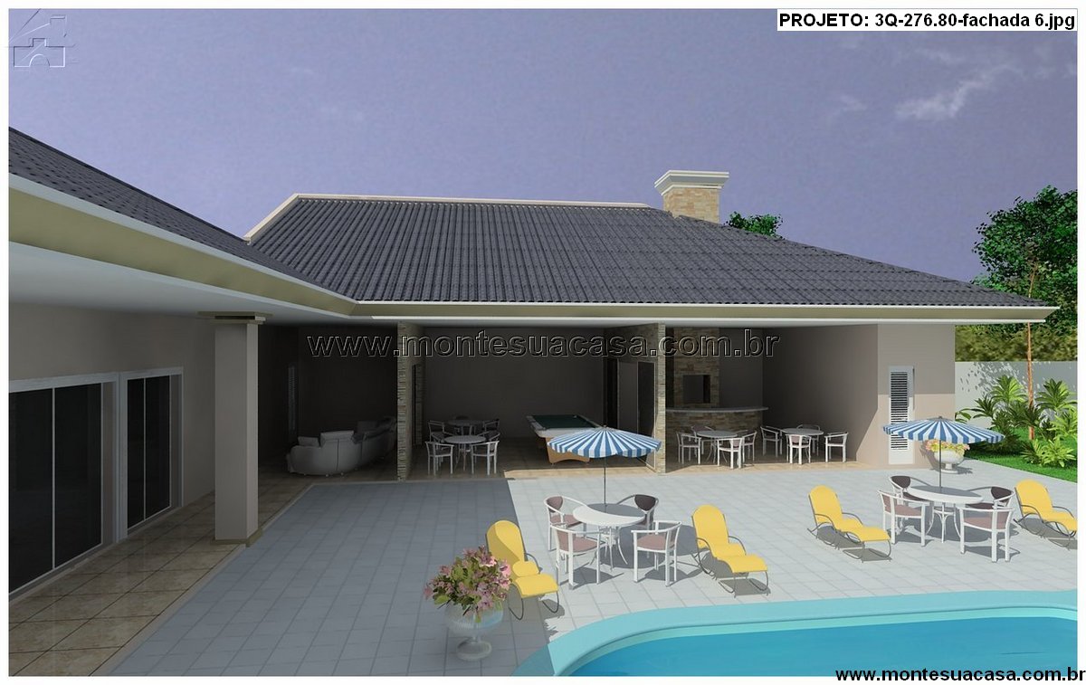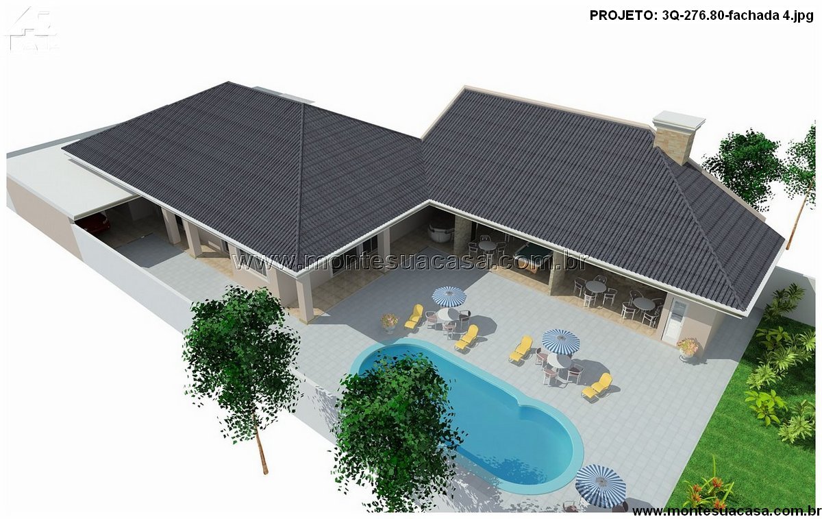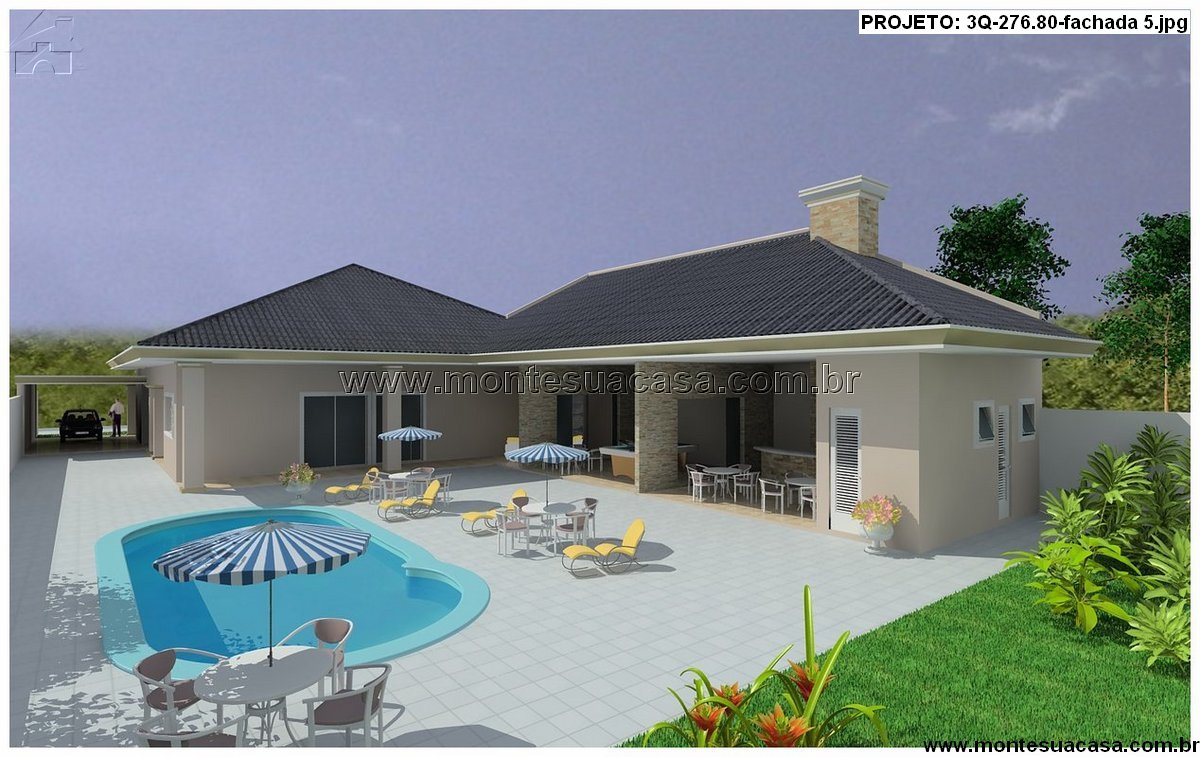 Este projeto de residência térrea com 276,80m² combina funcionalidade, estética e bem-estar em cada detalhe. A planta contempla três quartos, incluindo uma suíte master com closet, além de uma demi-suíte que oferece praticidade e privacidade. A área social é ampla e integrada, com sala de estar, sala de jantar e escritório, criando ambientes acolhedores e versáteis para o dia a dia.