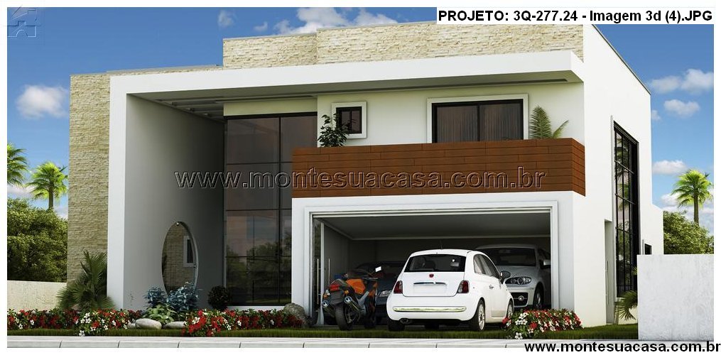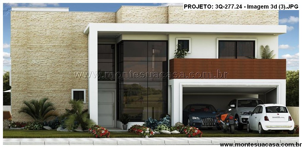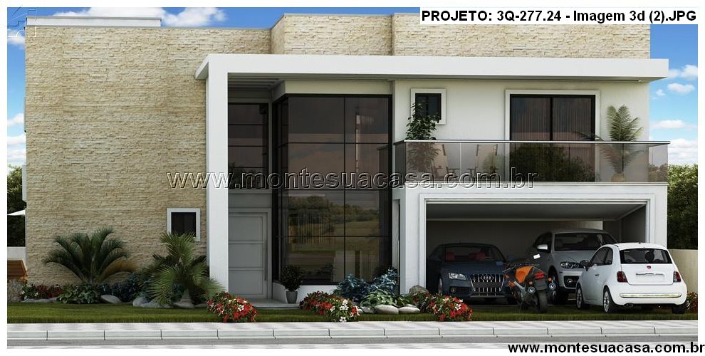 Este projeto de 277,24m² apresenta uma residência de dois pavimentos com estilo moderno e fachada marcante. A combinação de revestimentos em pedra bege, pintura branca e amplas esquadrias de vidro cria uma estética sofisticada e acolhedora. O destaque da fachada é o terraço com painel de madeira e guarda-corpo em vidro, que valoriza a volumetria e proporciona integração com o ambiente externo.