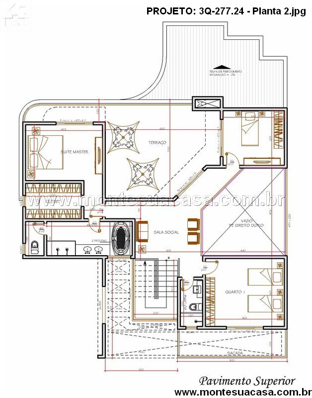 No pavimento superior, o layout privilegia o conforto e a privacidade. A suíte master é ampla, com banheiro exclusivo e acesso direto à sacada. Dois quartos adicionais oferecem espaço ideal para família ou hóspedes. A sala social conecta-se ao terraço, criando uma área perfeita para convivência e lazer. A escada central garante circulação fluida entre os pavimentos, enquanto o lavabo atende com praticidade a área íntima.