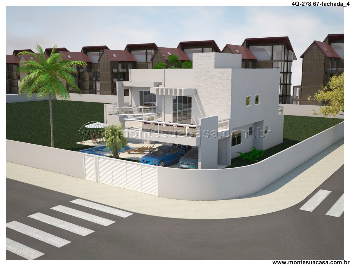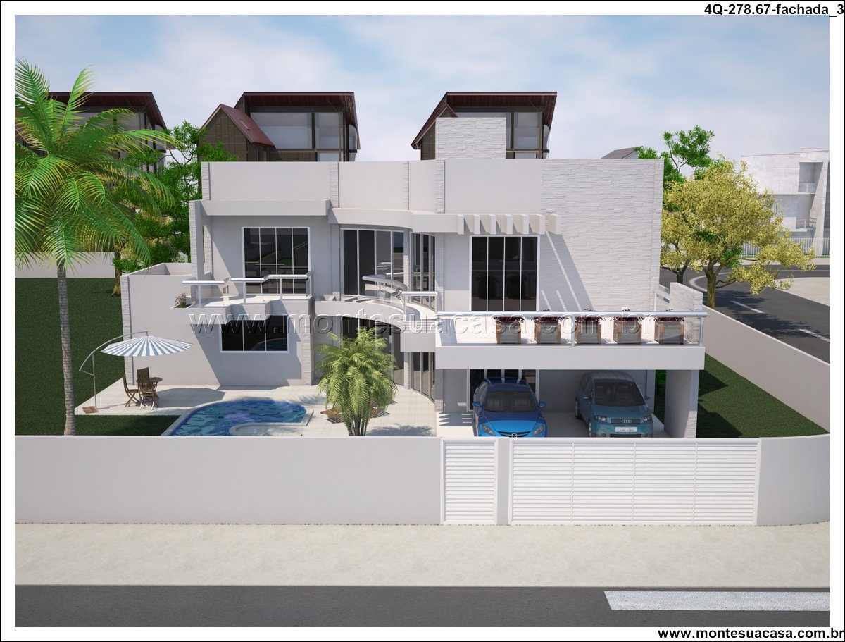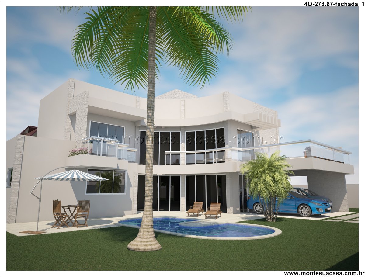 Sobrado moderno com 4 quartos e lazer completo Este projeto de sobrado de 278,67m² foi desenvolvido para famílias que valorizam conforto, funcionalidade e momentos de lazer em casa. Com arquitetura contemporânea e linhas retas, a fachada se destaca pelo uso de vidro, volumes bem definidos e varandas com guarda-corpo transparente. A estética moderna é complementada por um paisagismo tropical e uma piscina com formato orgânico.