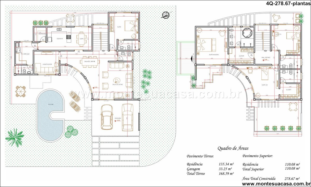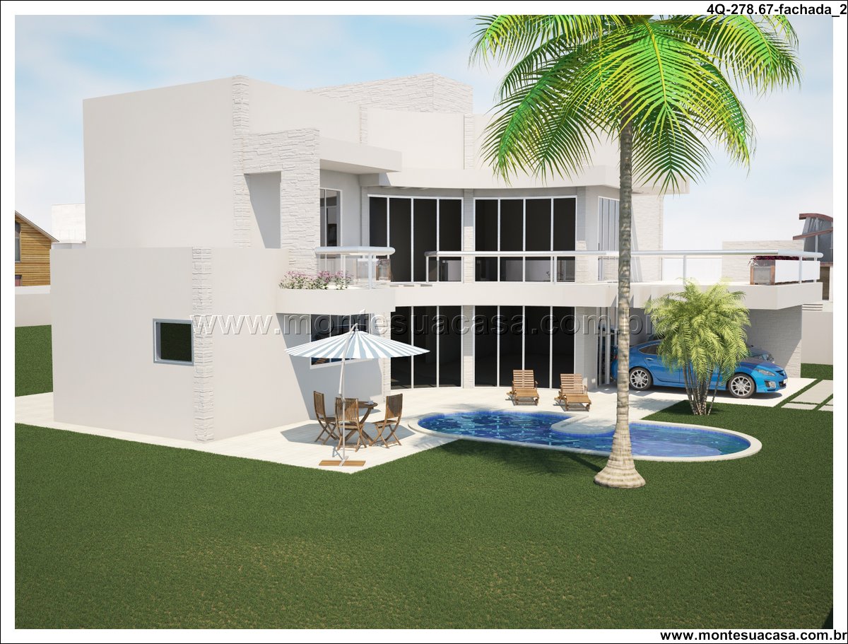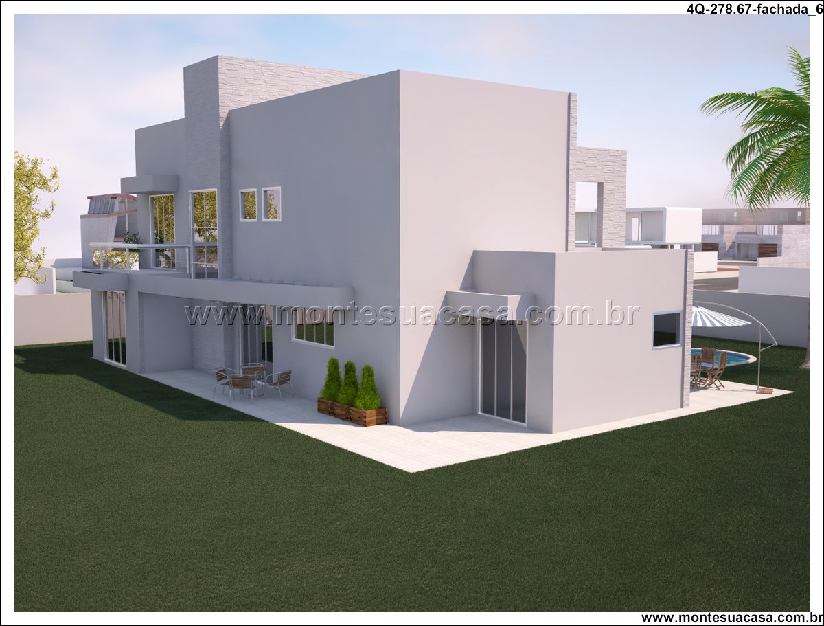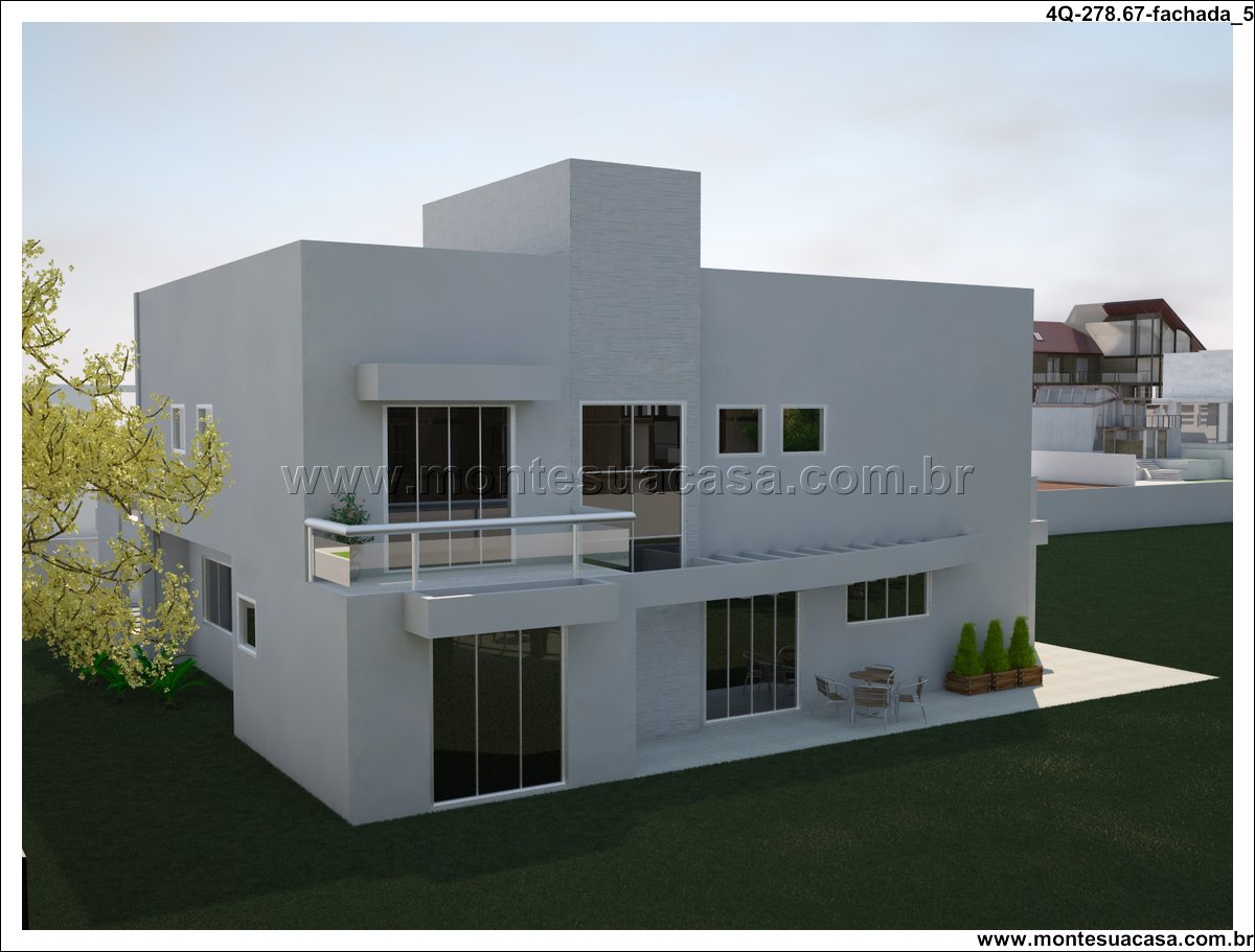 Sobrado moderno com 4 quartos e lazer completo Este projeto de sobrado de 278,67m² foi desenvolvido para famílias que valorizam conforto, funcionalidade e momentos de lazer em casa. Com arquitetura contemporânea e linhas retas, a fachada se destaca pelo uso de vidro, volumes bem definidos e varandas com guarda-corpo transparente. A estética moderna é complementada por um paisagismo tropical e uma piscina com formato orgânico.