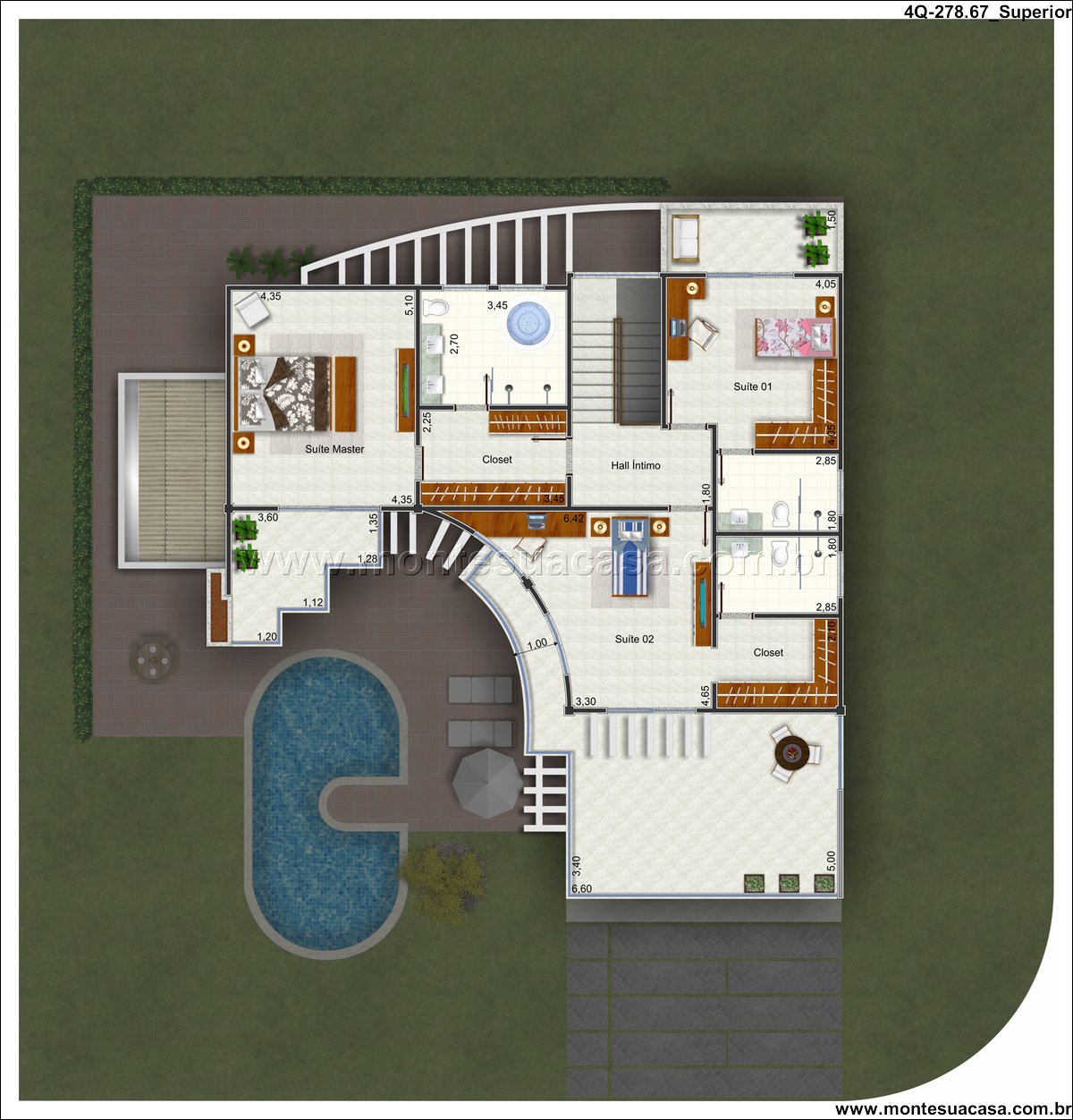 Pavimento superior com três suítes e hall íntimo No andar superior, o projeto contempla três suítes, incluindo uma suíte master com closet e banheiro espaçoso. O hall íntimo conecta os dormitórios e oferece acesso à varanda, criando um ambiente acolhedor. Uma jacuzzi posicionada no hall reforça o caráter exclusivo do projeto.
