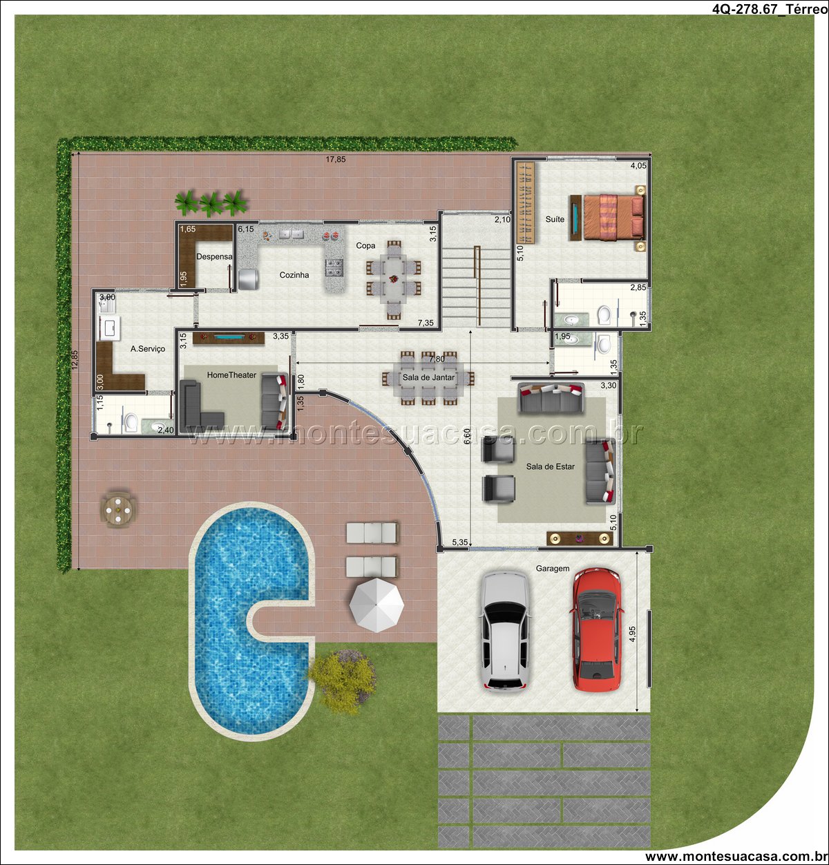 Área externa com piscina e paisagismo tropical A área de lazer é um dos pontos altos do projeto. A piscina em formato curvo se harmoniza com o jardim, que inclui palmeiras e gramado. O espaço conta com mesa, cadeiras e guarda-sol, ideal para refeições ao ar livre. A garagem coberta para dois carros garante praticidade e segurança.