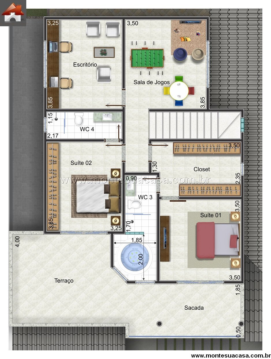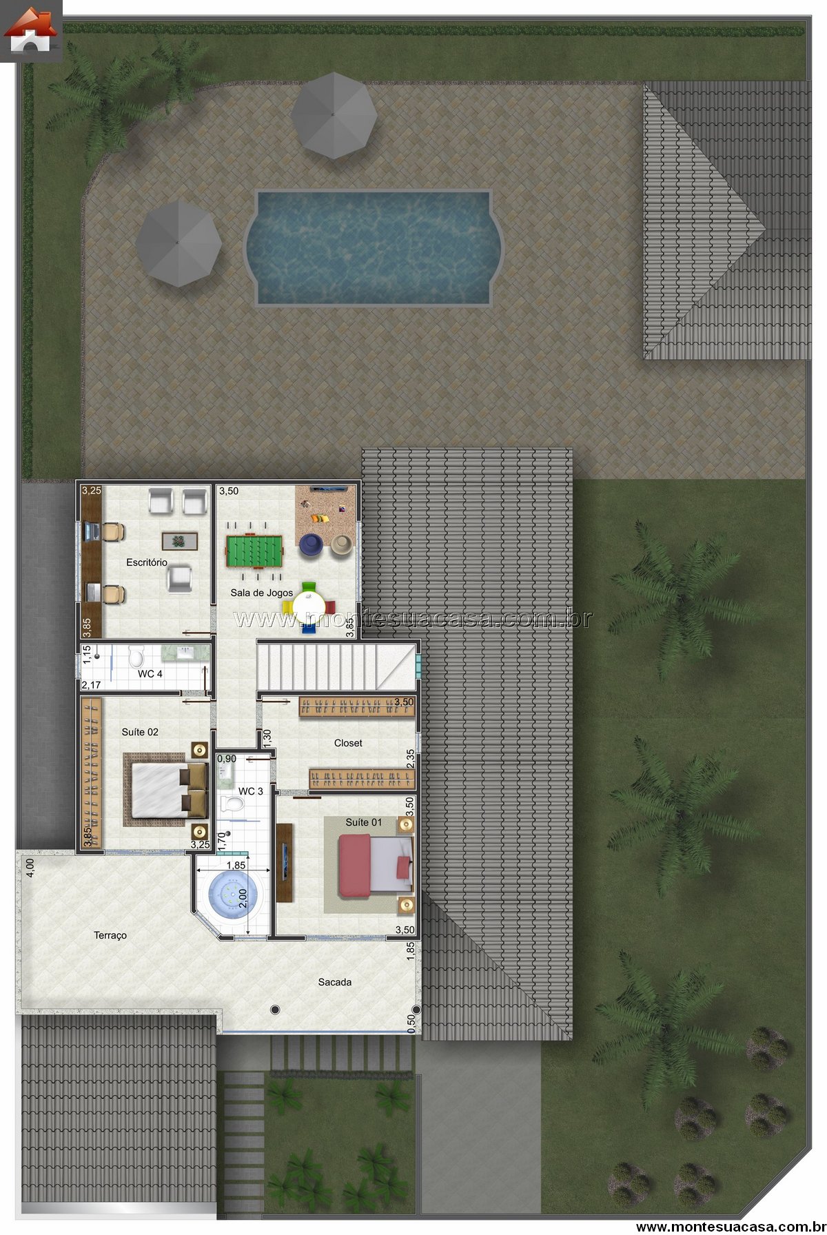Espaços complementares e versatilidade O andar superior inclui ainda uma sala de jogos e um escritório, perfeitos para momentos de entretenimento ou trabalho remoto. O terraço lateral é um convite para contemplação e pode ser adaptado como jardim suspenso ou área gourmet. A climatização da casa cobre 190,61m², otimizando o conforto térmico em todos os ambientes internos.