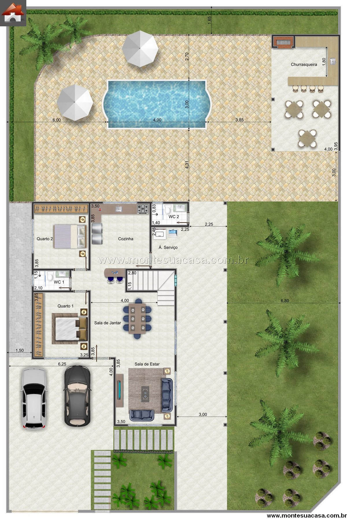 Design moderno e valorização do terreno Com fachada imponente e uso de materiais nobres, o projeto valoriza o terreno e se destaca pela harmonia entre linhas retas e elementos naturais. A piscina, o jardim frontal e os detalhes em vidro reforçam a proposta de uma casa elegante e funcional.