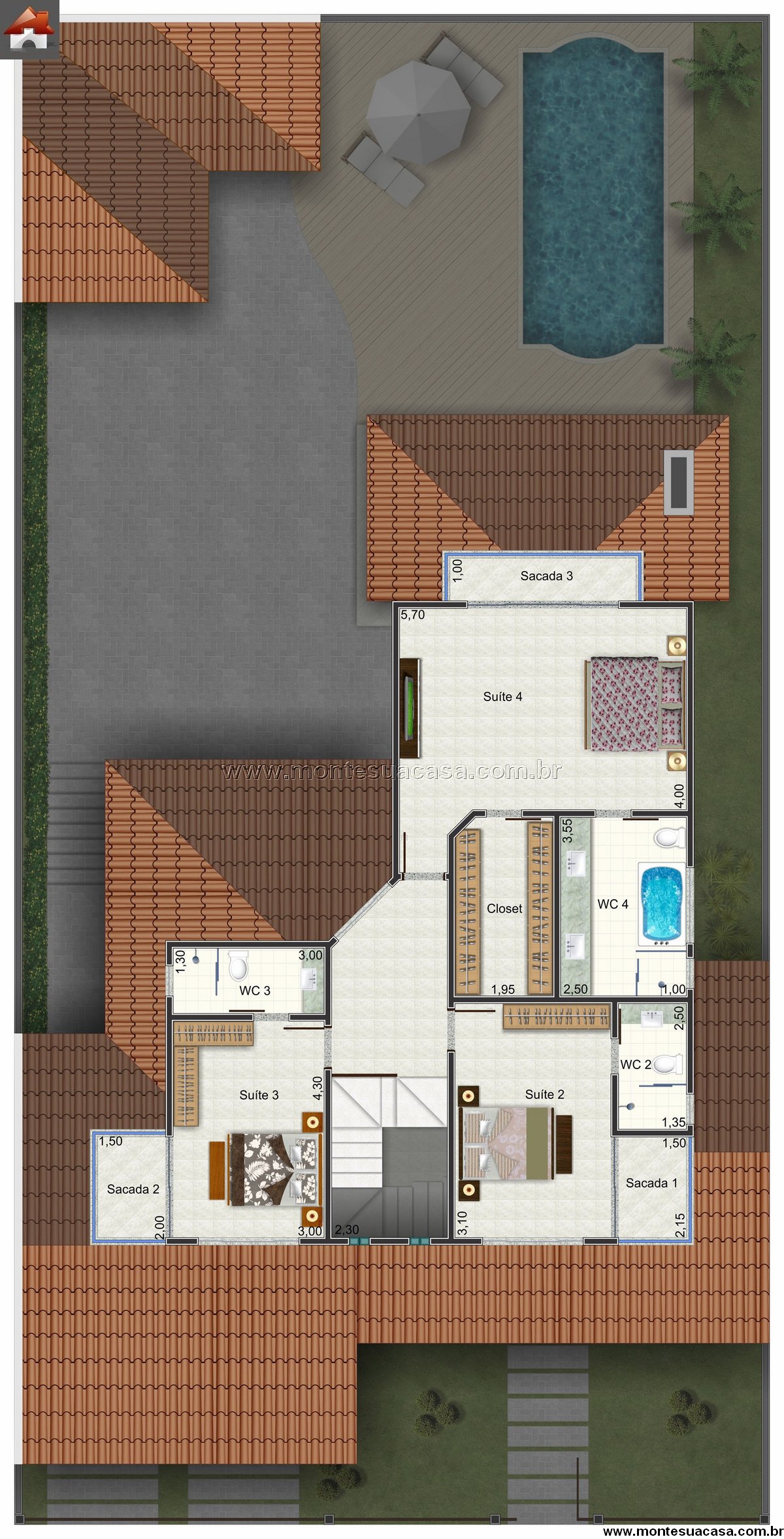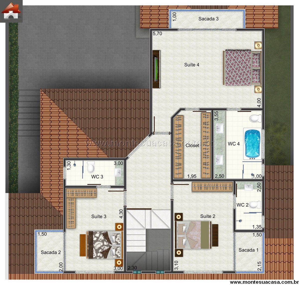 Conforto e privacidade no pavimento superior O andar superior abriga quatro suítes, todas com sacadas privativas e banheiros completos. A suíte master se destaca com closet amplo e banheiro com banheira. A circulação entre os quartos é facilitada por um hall central, garantindo privacidade e conforto para todos os moradores.