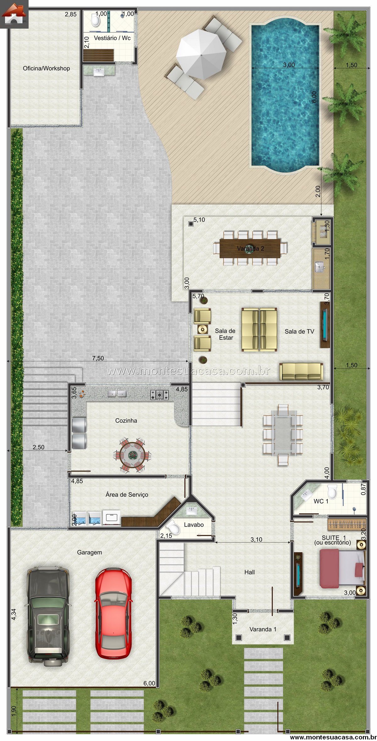 Detalhes que valorizam o projeto A área externa é um verdadeiro convite ao relaxamento, com piscina de 3,00m x 6,00m, deck com espreguiçadeiras e paisagismo tropical. A oficina com banheiro próprio amplia as possibilidades de uso do espaço. O projeto valoriza iluminação natural, ventilação cruzada e integração entre os ambientes internos e externos.