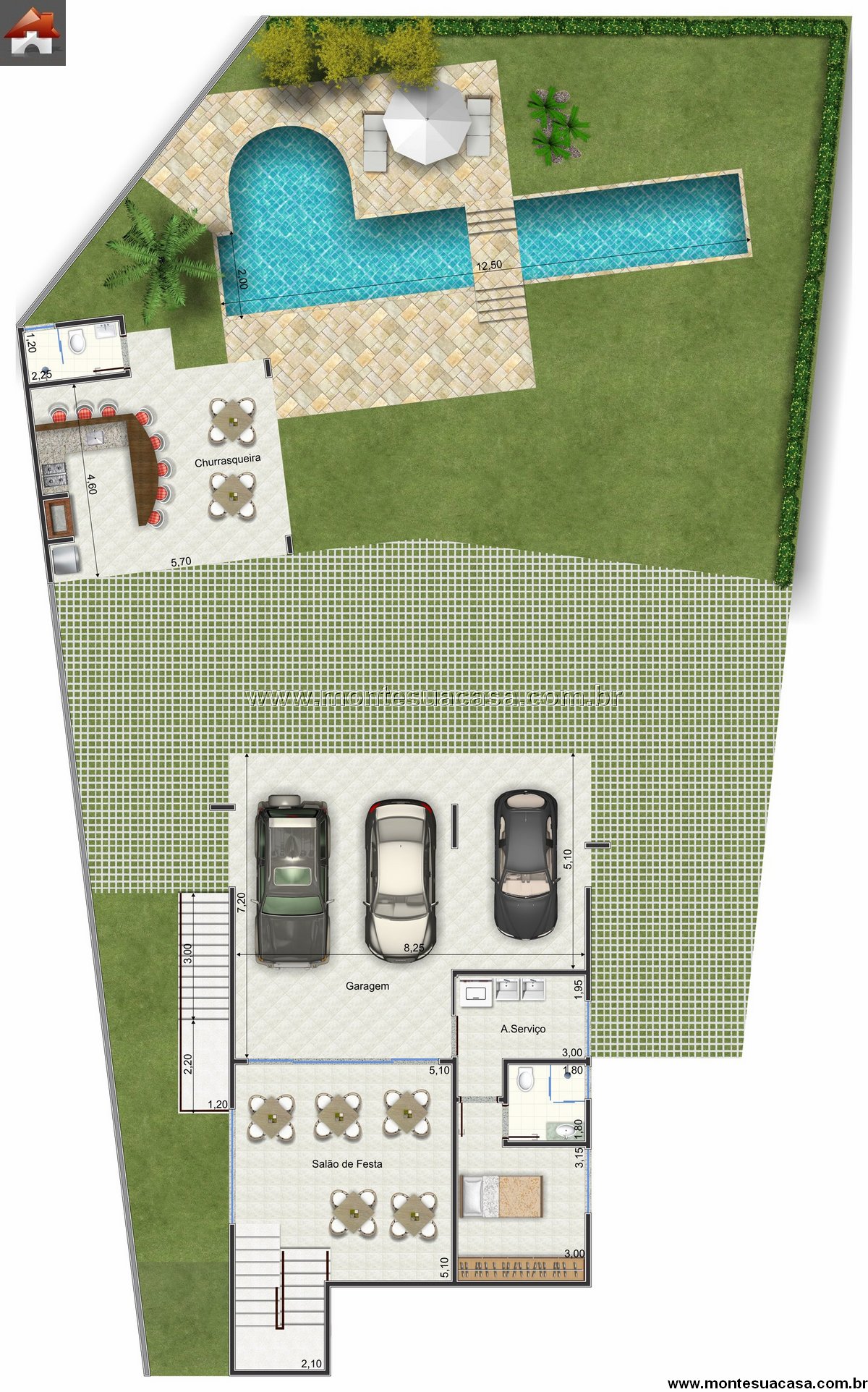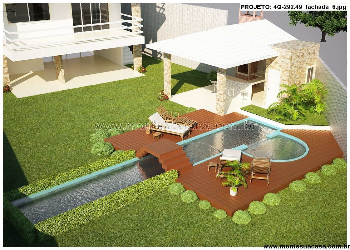 Lazer completo com piscina e churrasqueira A área externa é um dos grandes destaques do projeto. A piscina com formato orgânico e canal lateral se integra ao deck de madeira e ao espaço gourmet coberto, equipado com churrasqueira, bancada e mesa para refeições ao ar livre. O salão de festas, próximo à garagem para três carros, amplia as possibilidades de convivência.