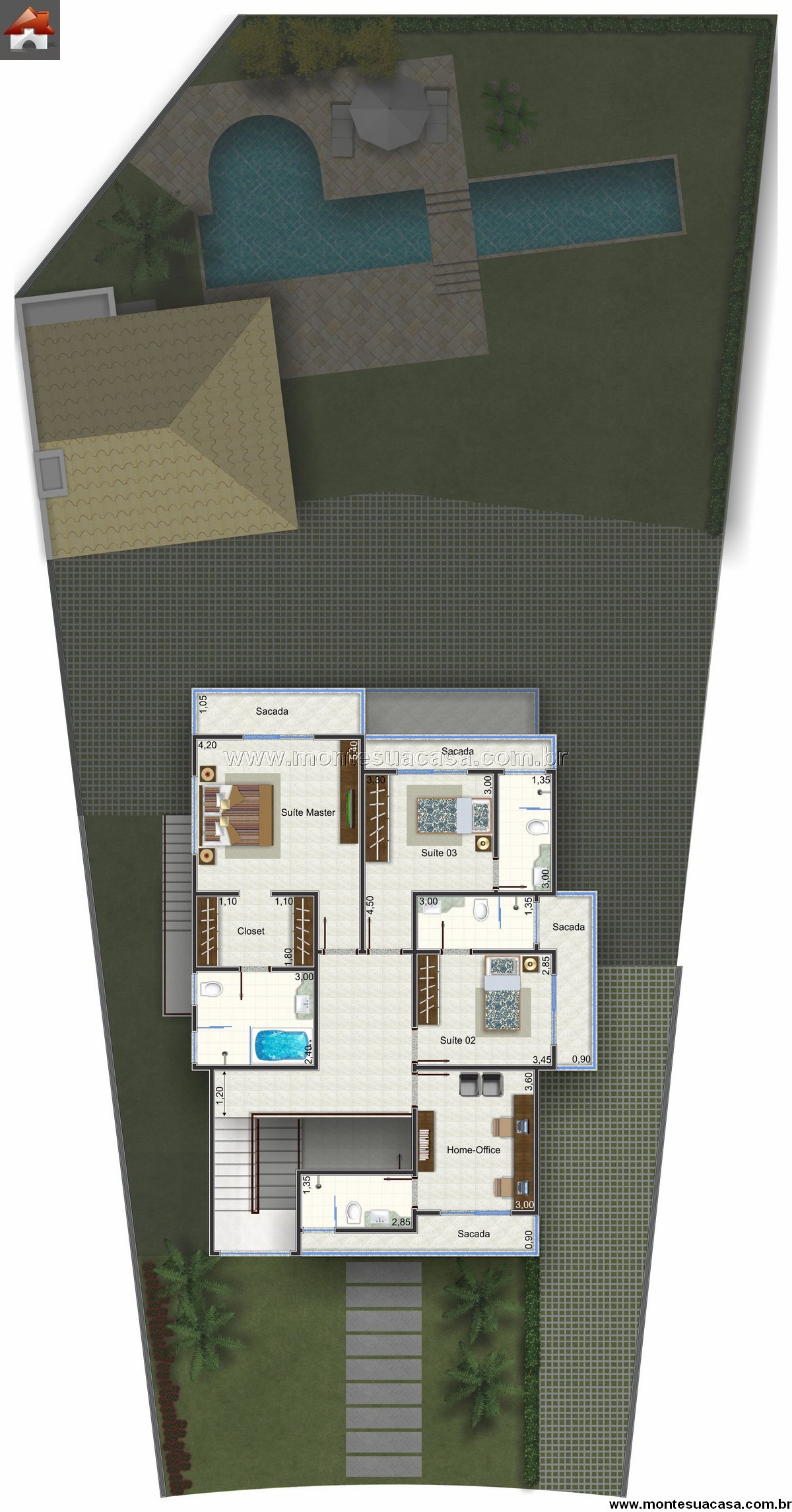 Quatro suítes e home office no pavimento superior O andar superior abriga quatro suítes, incluindo uma suíte master com closet e banheiro espaçoso. Todas as suítes possuem sacadas privativas, garantindo iluminação e ventilação. O home office, estrategicamente posicionado, atende às demandas de trabalho remoto com conforto e privacidade.