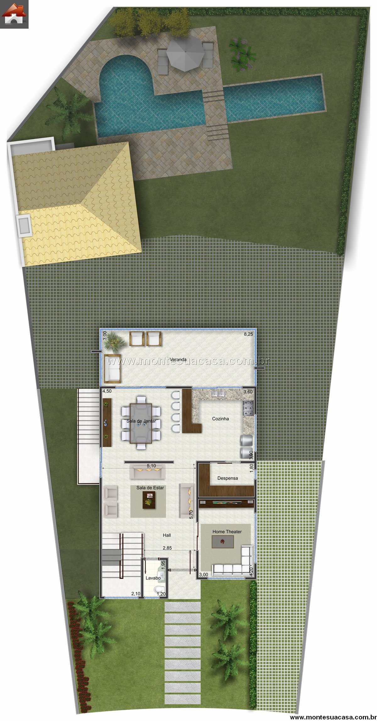 Área social integrada e funcional No pavimento térreo, os espaços sociais se conectam de forma fluida. A sala de estar ampla se une à sala de jantar e à cozinha, criando um ambiente acolhedor e perfeito para receber convidados. A varanda frontal proporciona charme e ventilação natural, enquanto o home theater oferece privacidade para momentos de entretenimento.