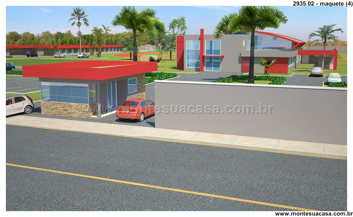 Design contemporâneo e paisagismo tropical A arquitetura valoriza linhas modernas com fachadas em tons neutros e detalhes em vermelho, criando identidade visual marcante. O paisagismo com palmeiras e áreas verdes reforça a estética tropical, tornando o ambiente agradável e acolhedor. A organização dos blocos e circulações foi pensada para maximizar a eficiência operacional do centro.
