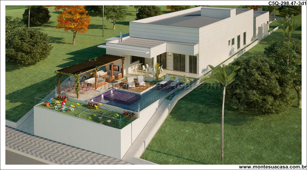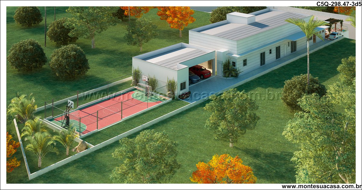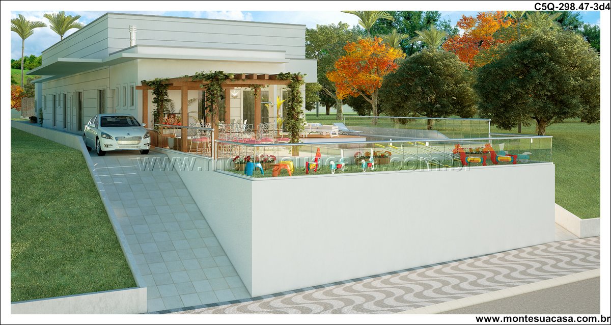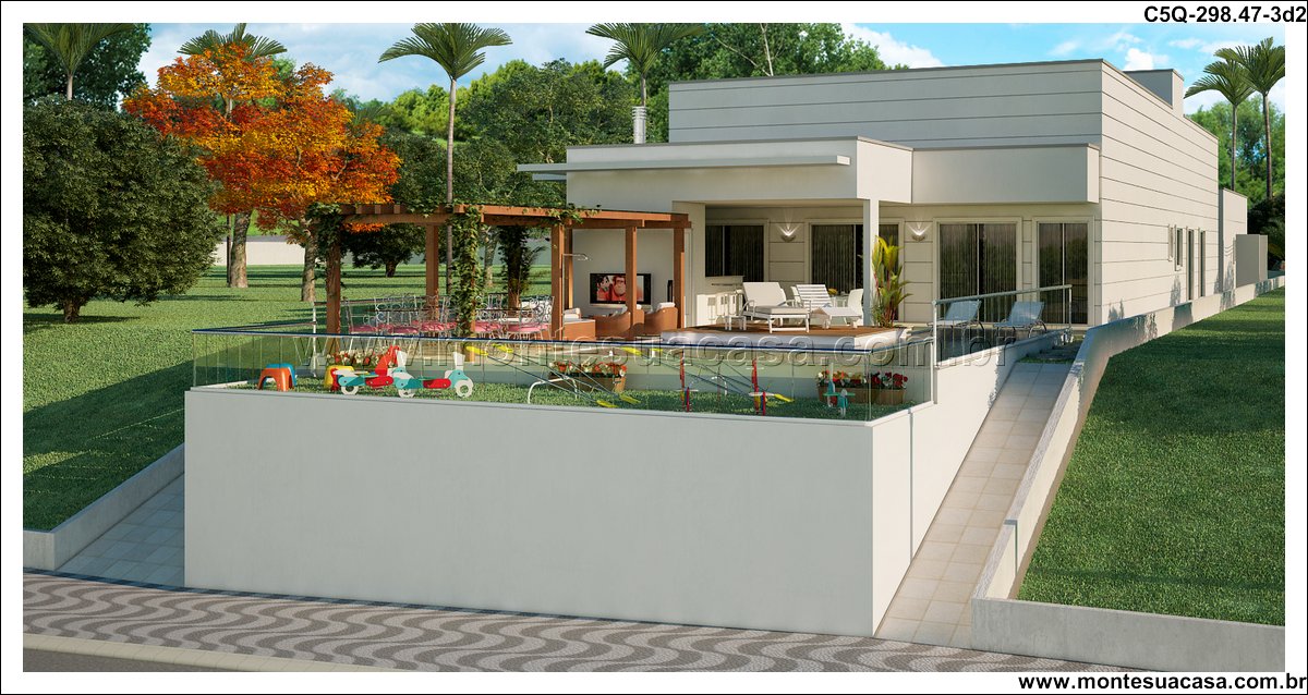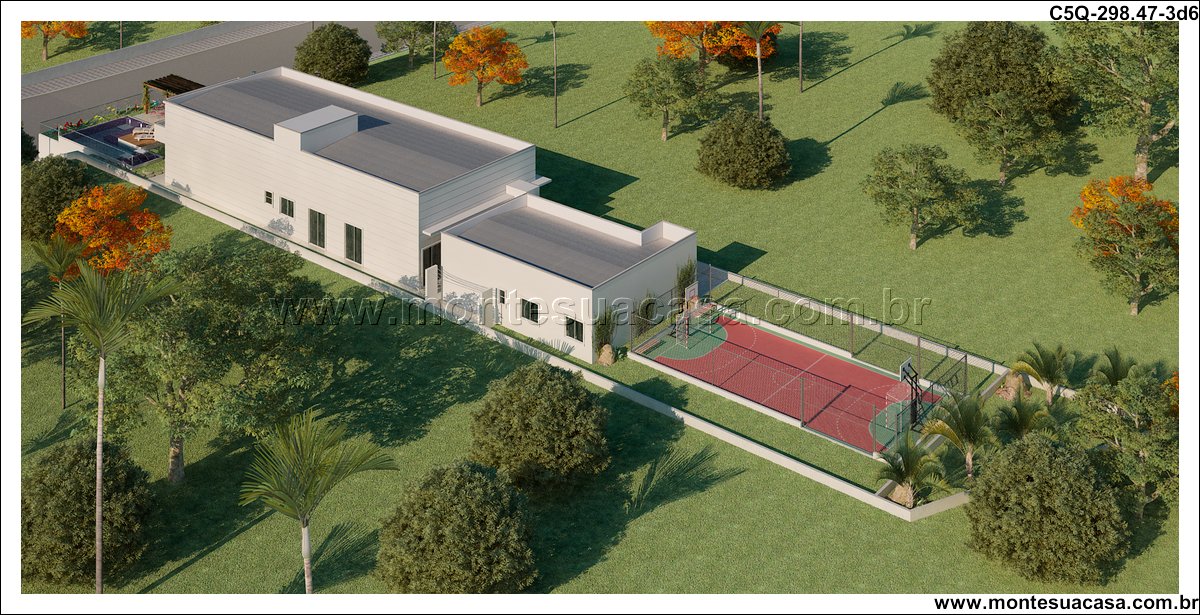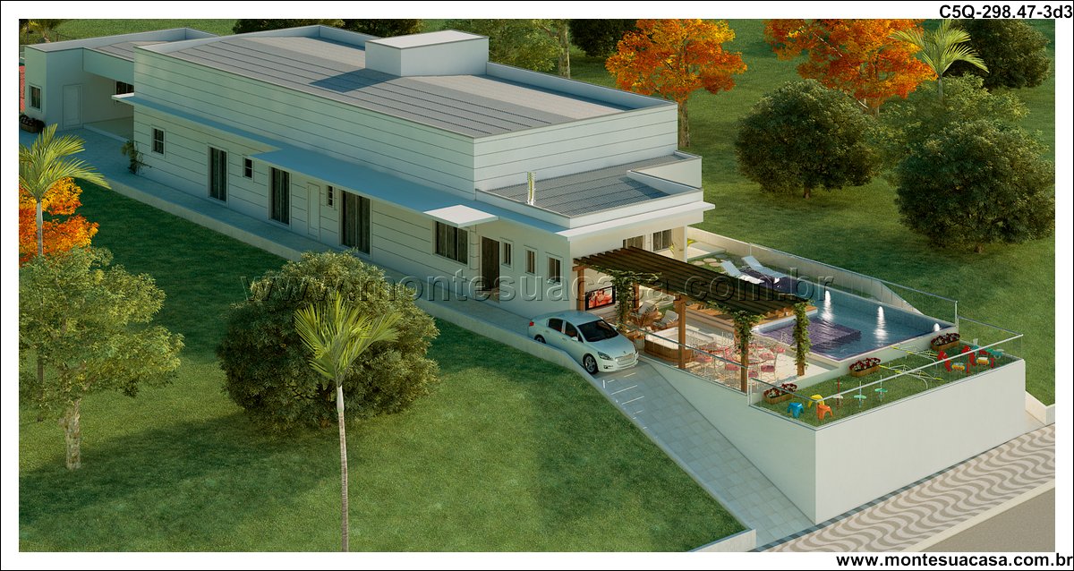 Esta residência de 298.47 m² foi especialmente desenvolvida para terreno em aclive, aproveitando o desnível natural para criar uma volumetria dinâmica e cheia de personalidade. O projeto distribui harmonicamente os cinco quartos em diferentes níveis, garantindo privacidade e vistas privilegiadas para todos os ambientes. Através de soluções técnicas inteligentes, a arquitetura dialoga constantemente com a topografia original, criando uma relação única entre construção e natureza. A fachada principal se apresenta com linhas contemporâneas que se adaptam perfeitamente à inclinação do terreno.