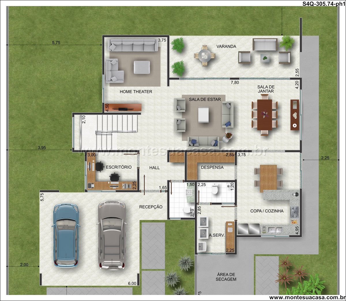 Este projeto de sobrado de 305.74m² apresenta uma distribuição inteligente em dois pavimentos, criando ambientes amplos e especializados para uma família contemporânea. A planta valoriza a integração social enquanto garante absoluta privacidade nos dormitórios. Com quatro quartos, sendo um deles uma suíte master com closet exclusivo, esta residência foi meticulosamente planejada para oferecer conforto e praticidade no dia a dia.