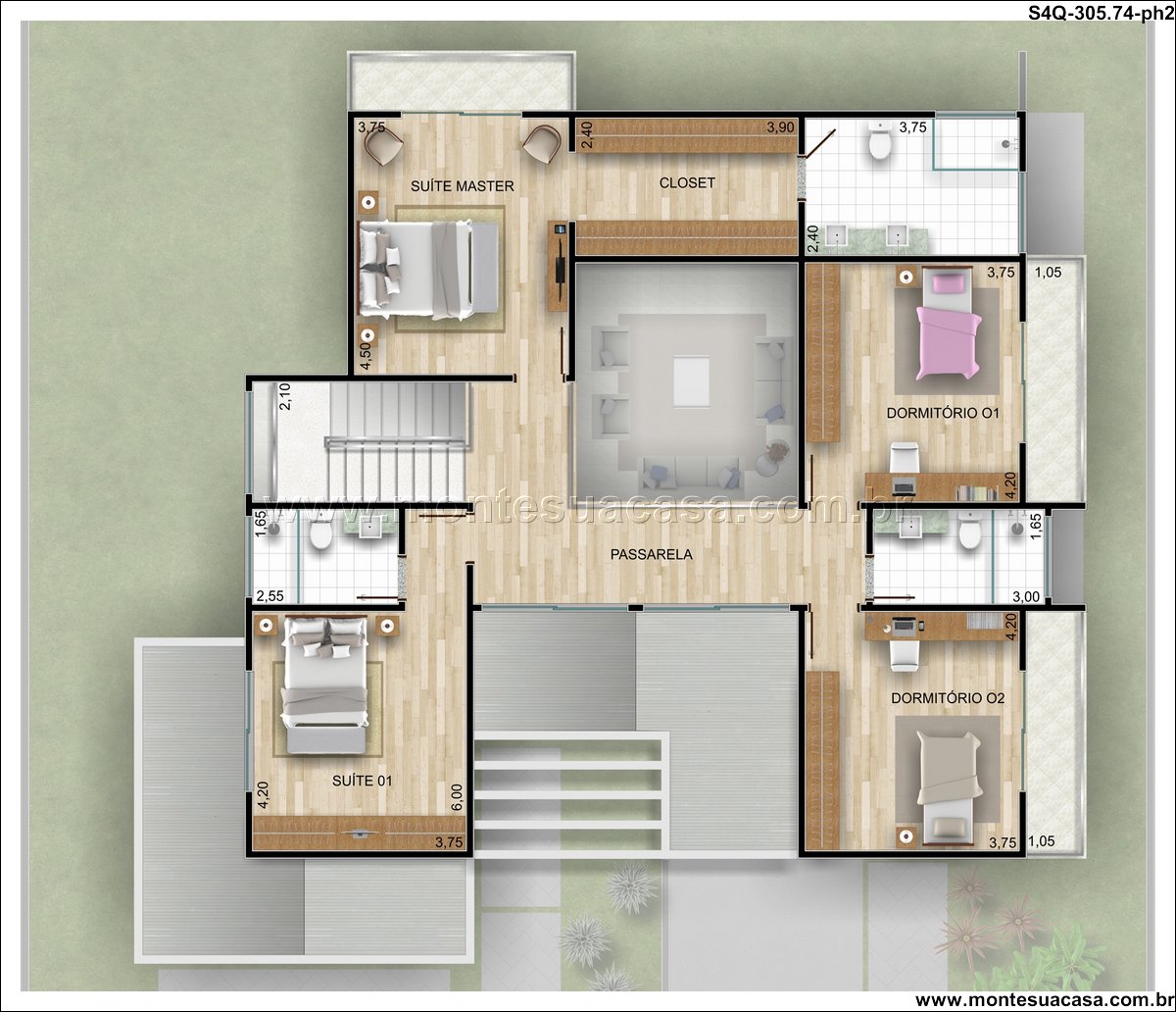 A escada leva você ao pavimento superior, onde a privacidade e o descanso reinam. A suíte master é um refúgio privativo, equipada com um closet organizado. Dois outros dormitórios, o Dormitório 01 e o Dormitório 02, compartilham uma passarela, garantindo circulação tranquila. Um escritório isolado proporciona o ambiente ideal para trabalho ou estudos, assegurando concentração. Este andar é um verdadeiro oásis de tranquilidade.