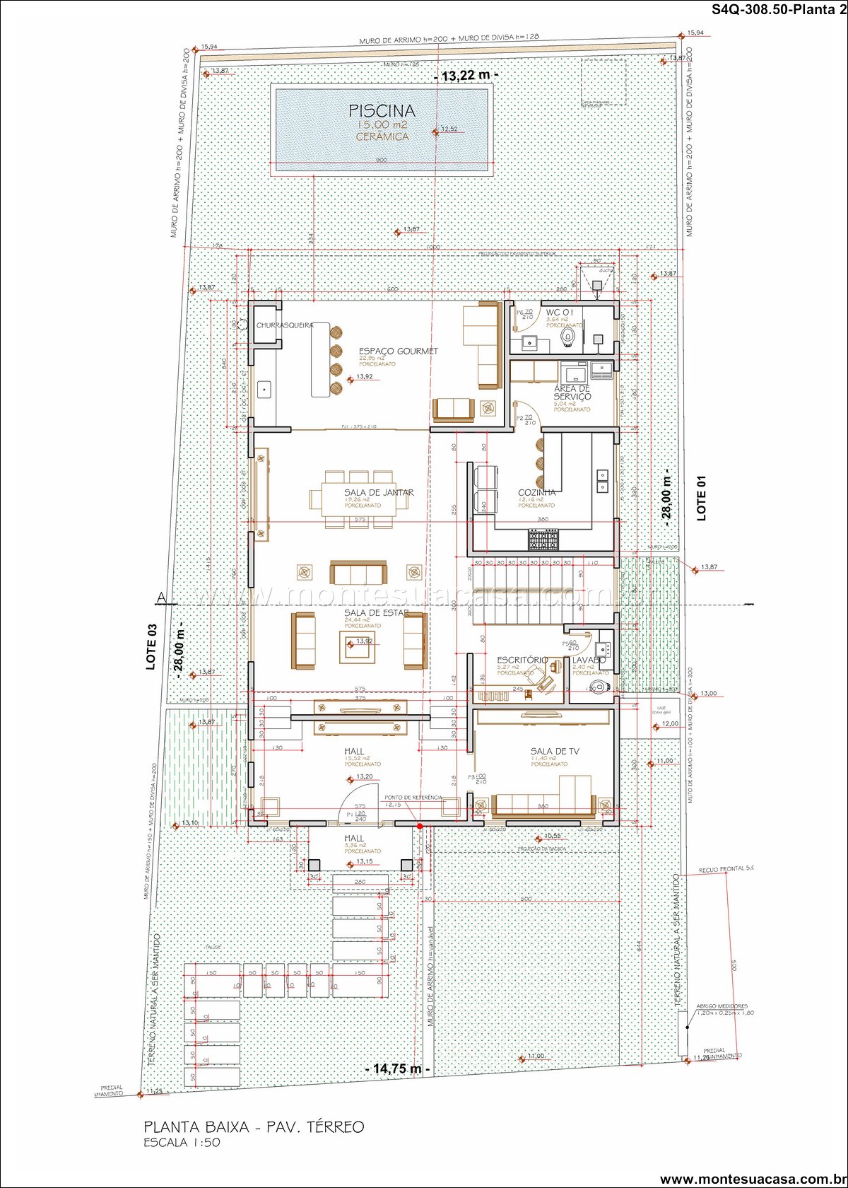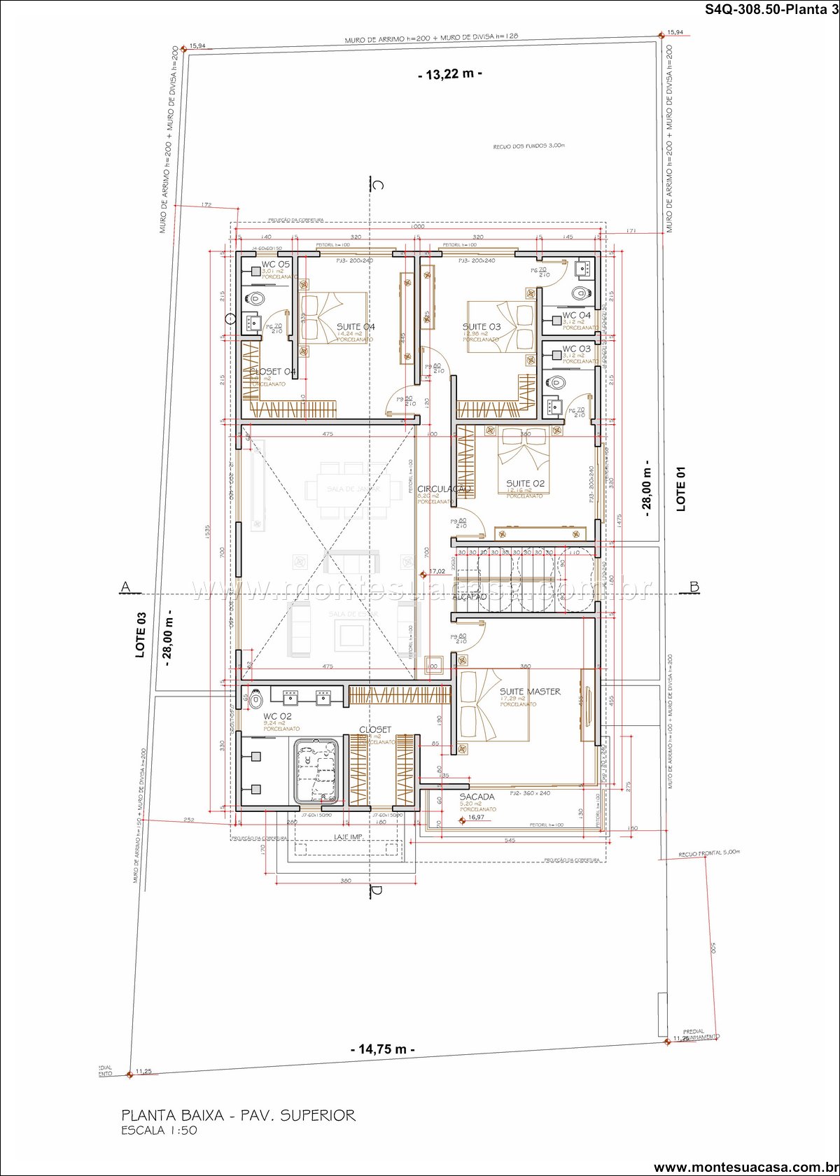 A planta funcional do sobrado é distribuída em dois pavimentos, organizando os ambientes de forma inteligente. O pavimento superior, conforme detalhado na planta baixa, abriga a área social e os quartos. Além disso, a residência conta com quatro quartos, garantindo amplo espaço para a família e visitas. Os ambientes são integrados para promover convívio, mas também são zonados para assegurar a necessária privacidade dos dormitórios. A circulação fluida entre os cômodos cria uma sensação de amplitude e conforto.