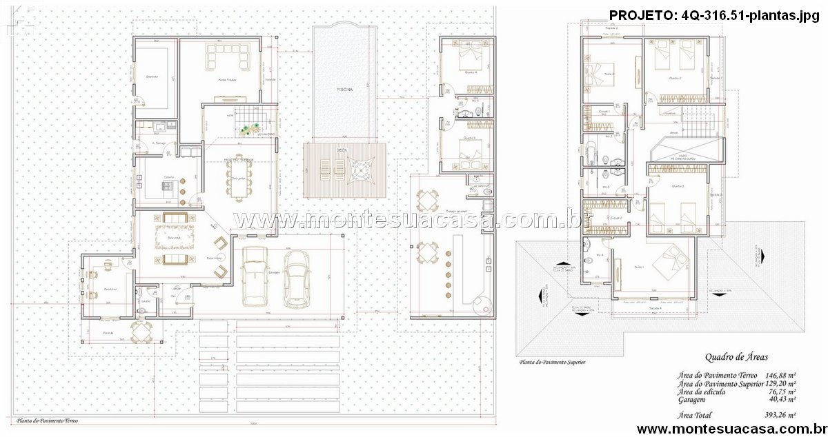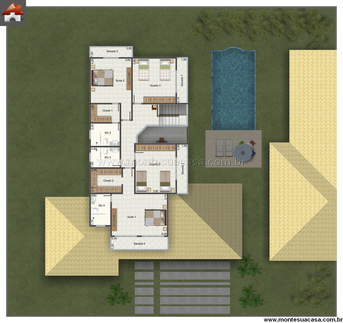 Área íntima e privacidade O pavimento superior abriga quatro dormitórios, incluindo duas suítes com closet e sacadas privativas. Os banheiros são bem distribuídos, garantindo praticidade para os moradores. A circulação interna foi projetada para oferecer conforto e privacidade, com destaque para a suíte principal, que conta com uma sacada ampla voltada para o jardim.