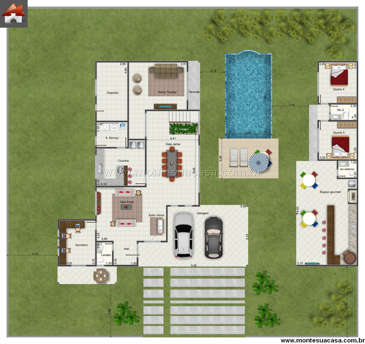 Infraestrutura completa A garagem coberta comporta dois veículos e está integrada ao acesso principal. O projeto inclui ainda escritório, home theater, lavabo, área de serviço e depósito. O jardim interno e o paisagismo ao redor da piscina valorizam o bem-estar e a conexão com a natureza.
