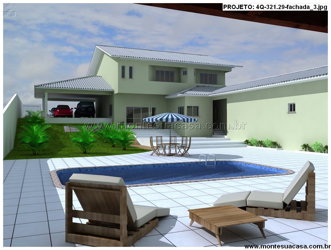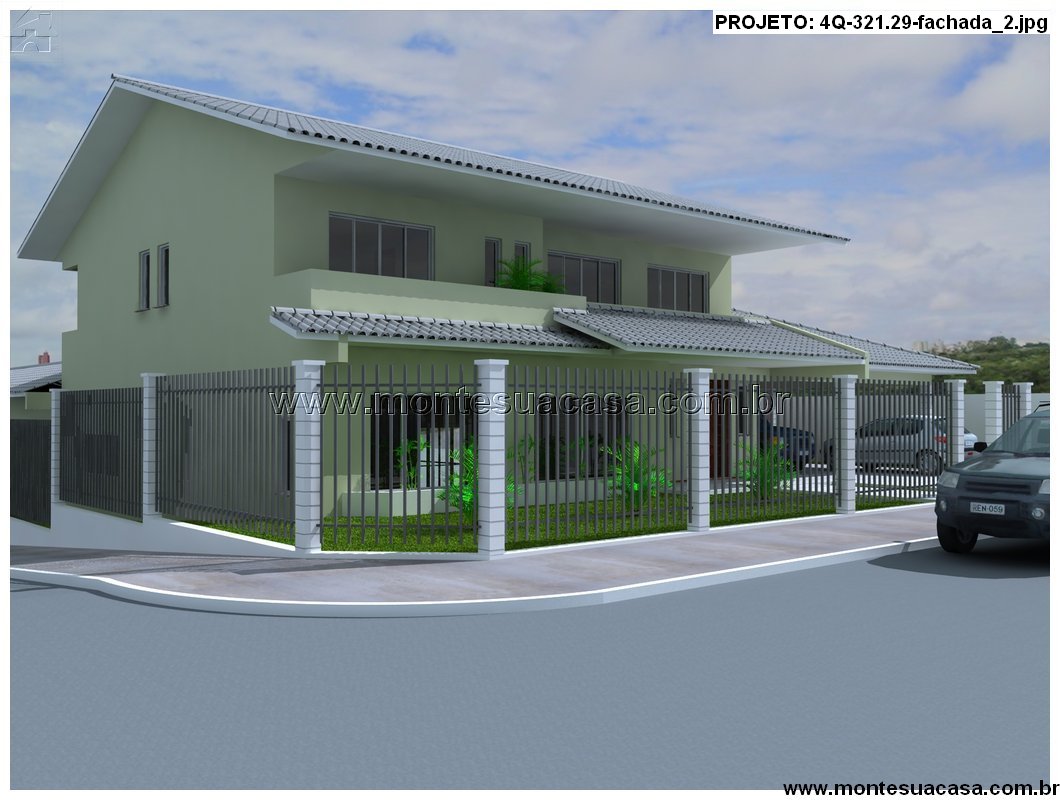 Este projeto de residência moderna com 321,29m² oferece uma proposta arquitetônica sofisticada e funcional, ideal para famílias que valorizam conforto, lazer e estética contemporânea. O sobrado apresenta fachada simétrica com telhado cerâmico inclinado, grandes janelas e acabamento em tom verde claro, criando uma atmosfera acolhedora e elegante.