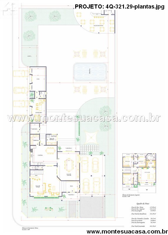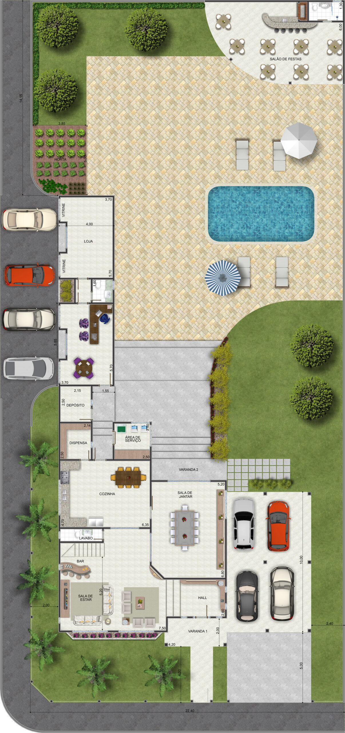 Detalhes técnicos e aproveitamento de espaço O projeto contempla ainda uma horta, duas varandas, e áreas técnicas bem posicionadas. A circulação entre os ambientes é fluida, e os espaços foram pensados para proporcionar funcionalidade sem abrir mão do design. A área total construída é de 403,29m², incluindo garagem e salão de festas.